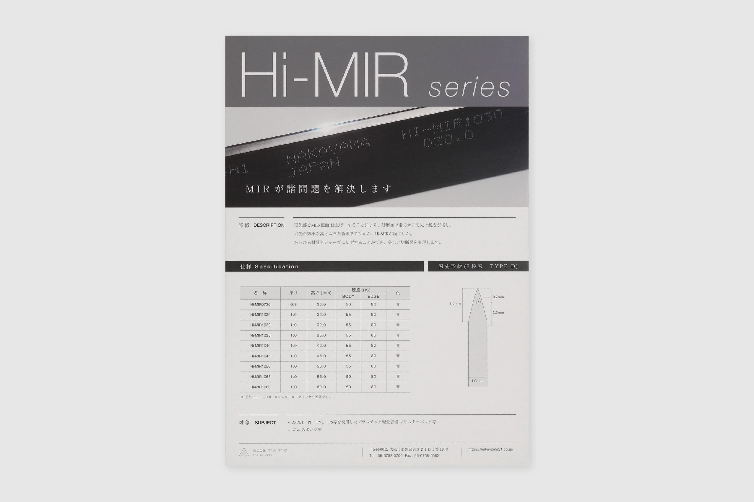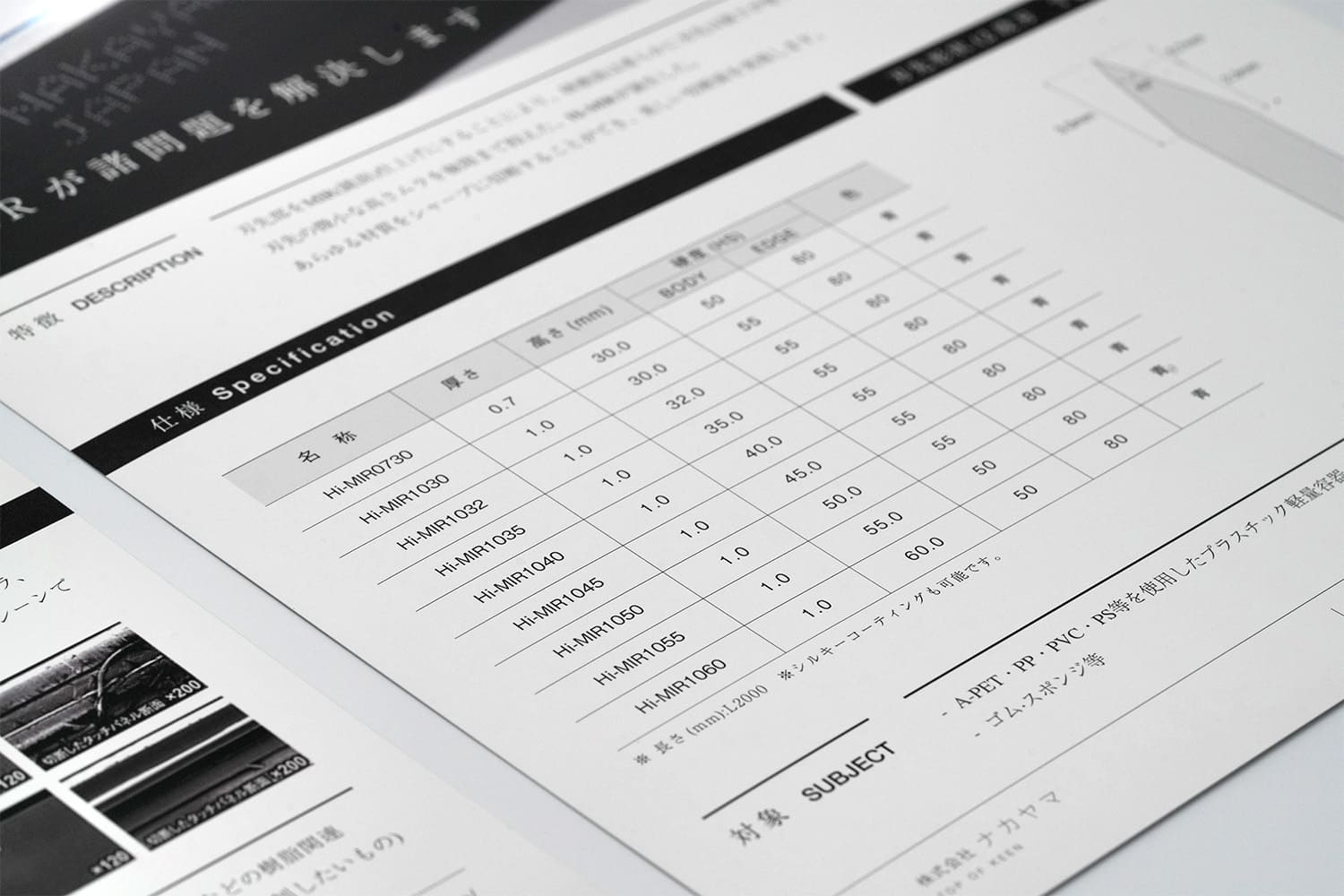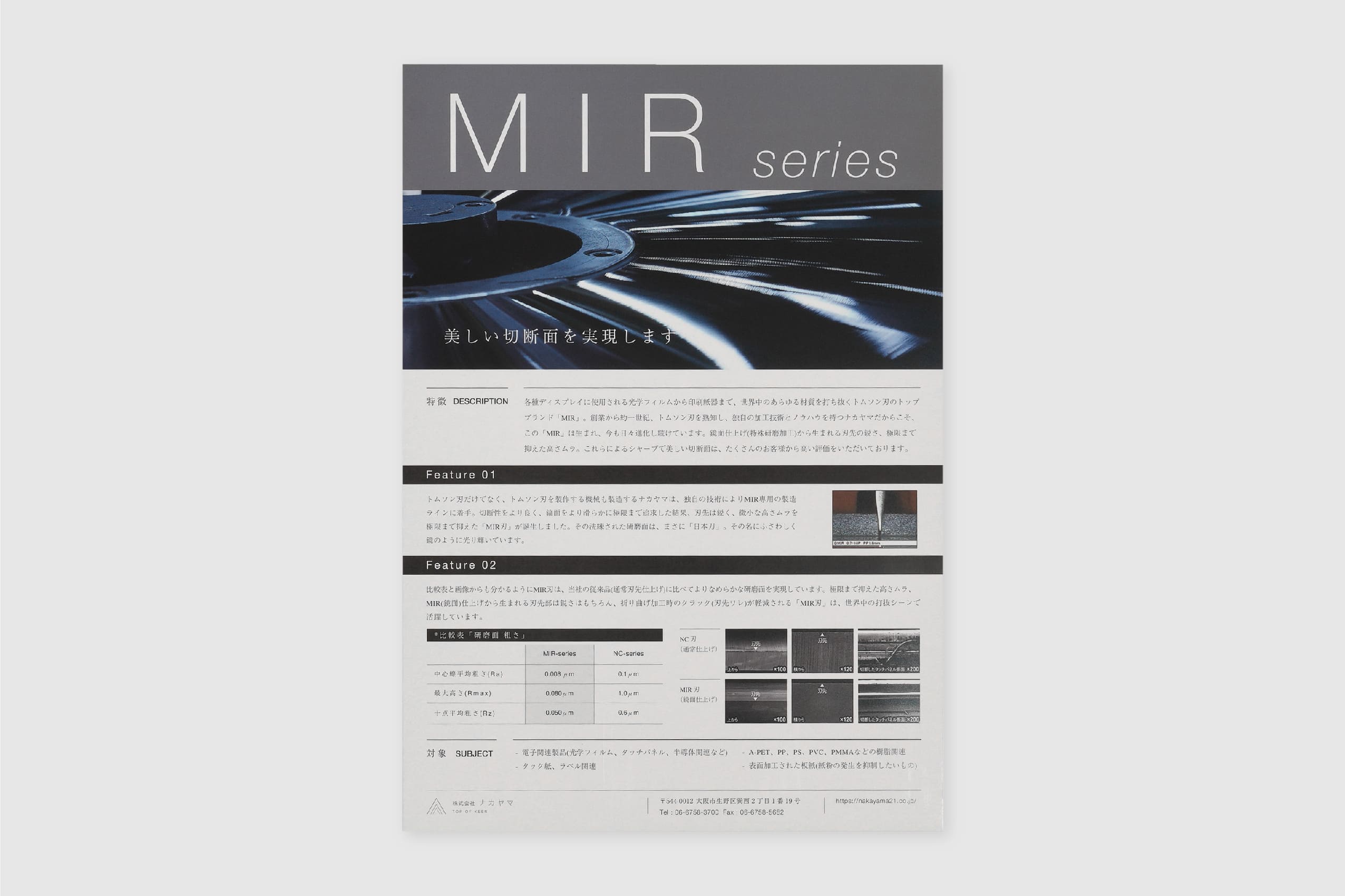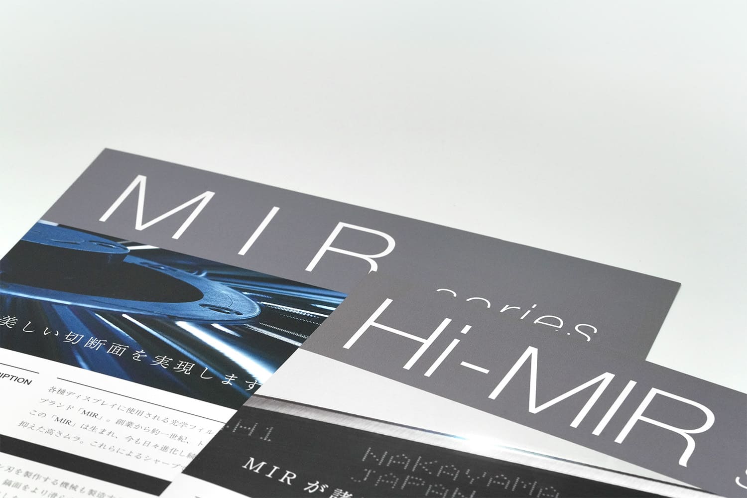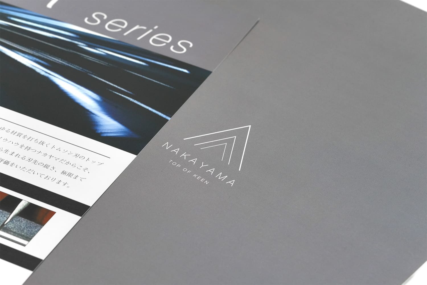 1937年創業。約1世紀にわたり世界一の品質でトムソン刃を製造し続けてこられた、株式会社ナカヤマ様の製品フライヤー。紙にツヤを出す加工が施されており、トムソン刃の鋭い光沢を表現しています。ロゴやWEBサイトのデザインに限らず、紙質や加工方法等細部に至るまでコンセプトを貫き通すことで、永い時間にも耐えうる強固な世界観を構築することが出来るのです。