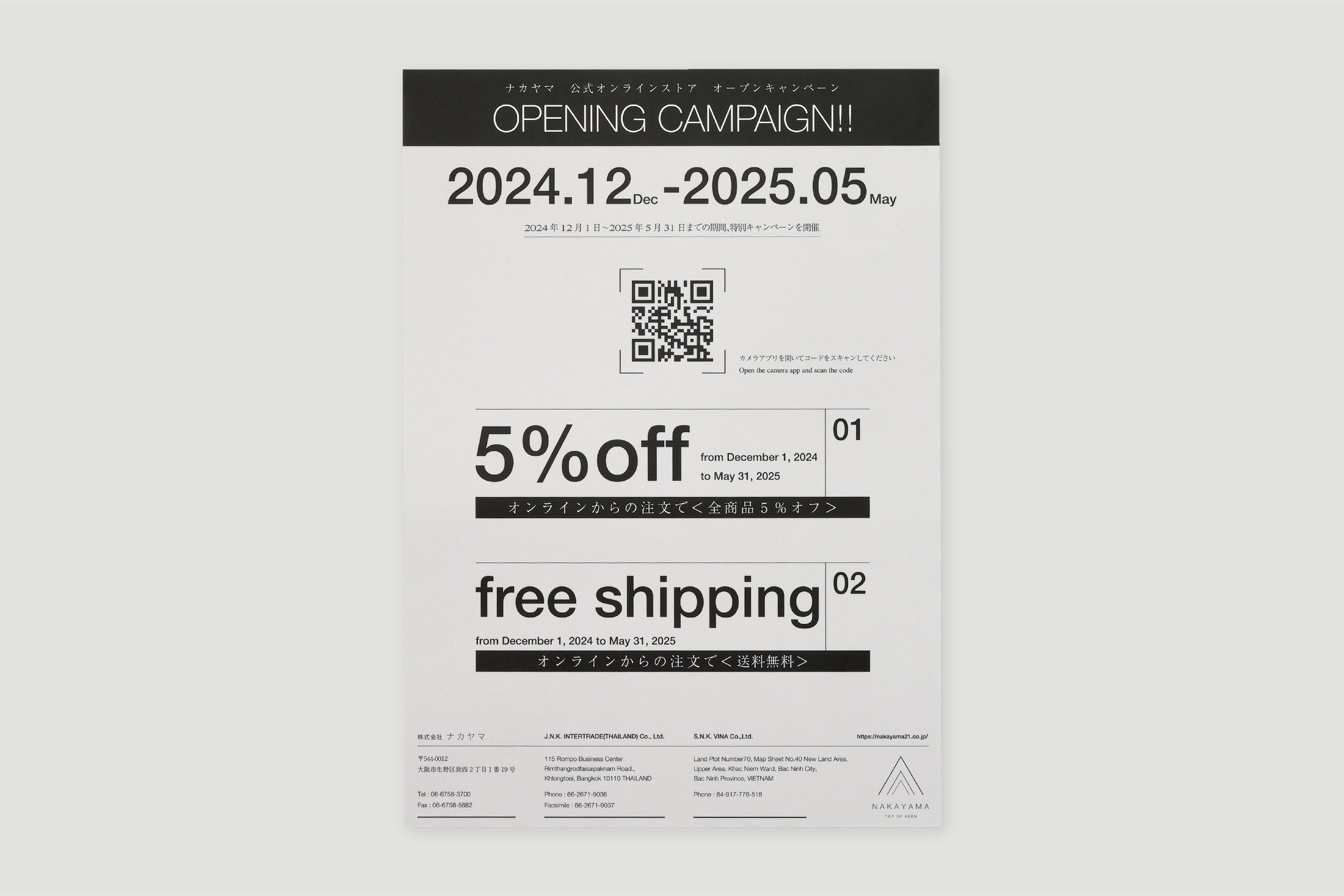 1937年創業。約1世紀にわたり世界一の品質でトムソン刃を製造し続けてこられた株式会社ナカヤマ様の、展示会用のキャンペーンチラシ。情報をすっきりと整理し、尚且つブランドの世界観も感じられる一枚。シンプル故に訴求したいポイントがダイレクトに伝わり、見る者を惹き込むチラシに仕上げました。