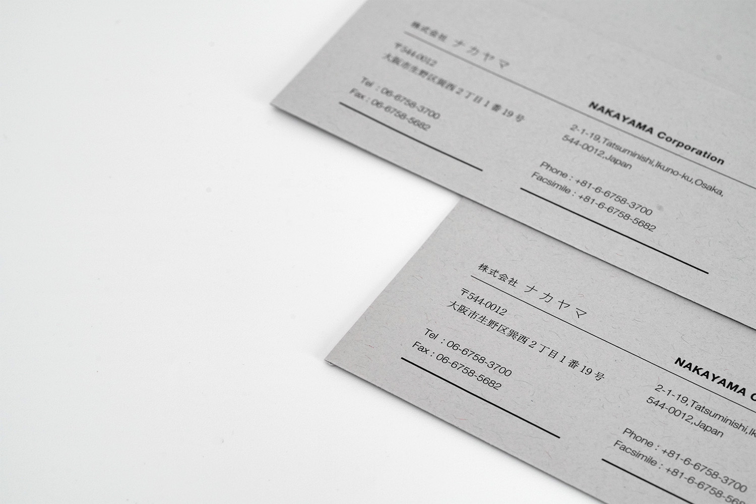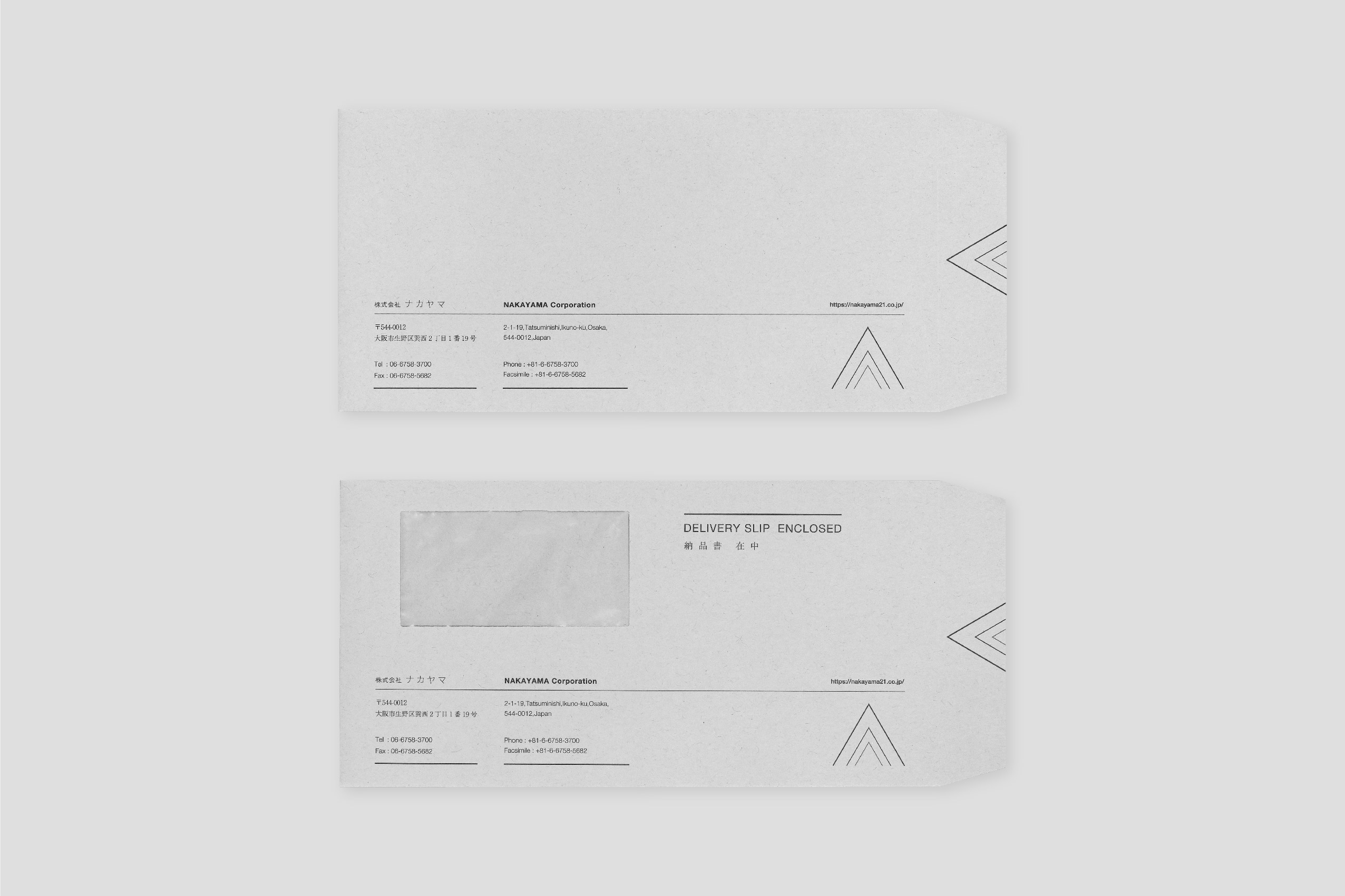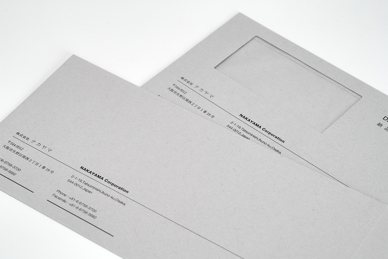 1937年創業。約1世紀にわたり世界一の品質でトムソン刃を製造し続けてこられた、株式会社ナカヤマ様の封筒。緻密にレイアウトされたラインのデザインが繊細で美しく、「世界一」を誇るナカヤマ様のアイデンティティを表現しています。グレーの紙との相性も良い。角2封筒には銀箔をあしらい、鮮烈なインパクトを与えるデザインに仕上がりました。