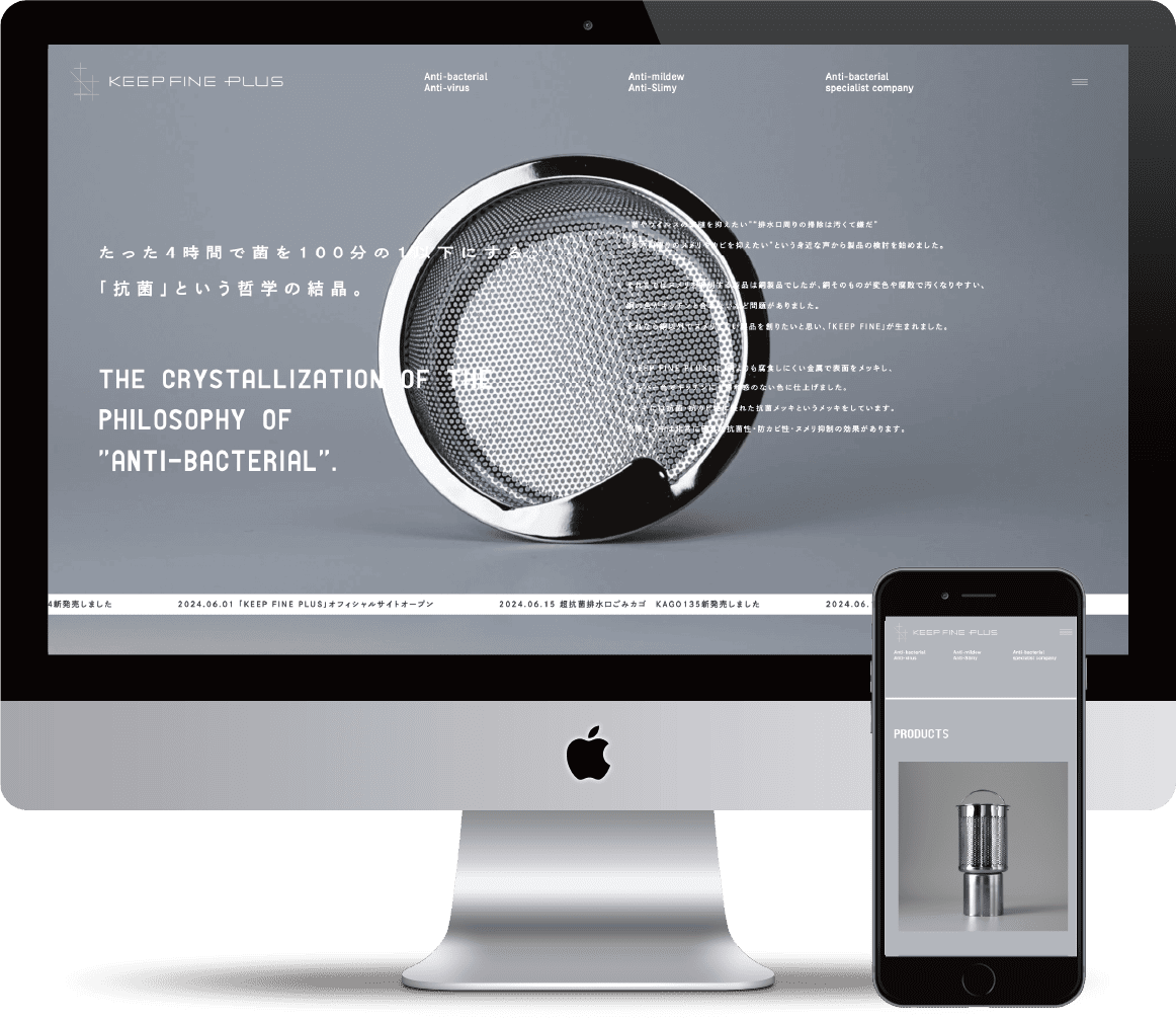 『KEEP FINE PLUS』は、抗菌・抗ウイルス・防カビのプロダクトブランド。抗菌性能が優れている事はもちろんのこと、使いやすさまで細部に拘ったプロダクツで、ロゴ・ホームページ・オンラインショップ・段ボール・ガムテープ・パッケージなどお客様が手に取る全てをデザインした。