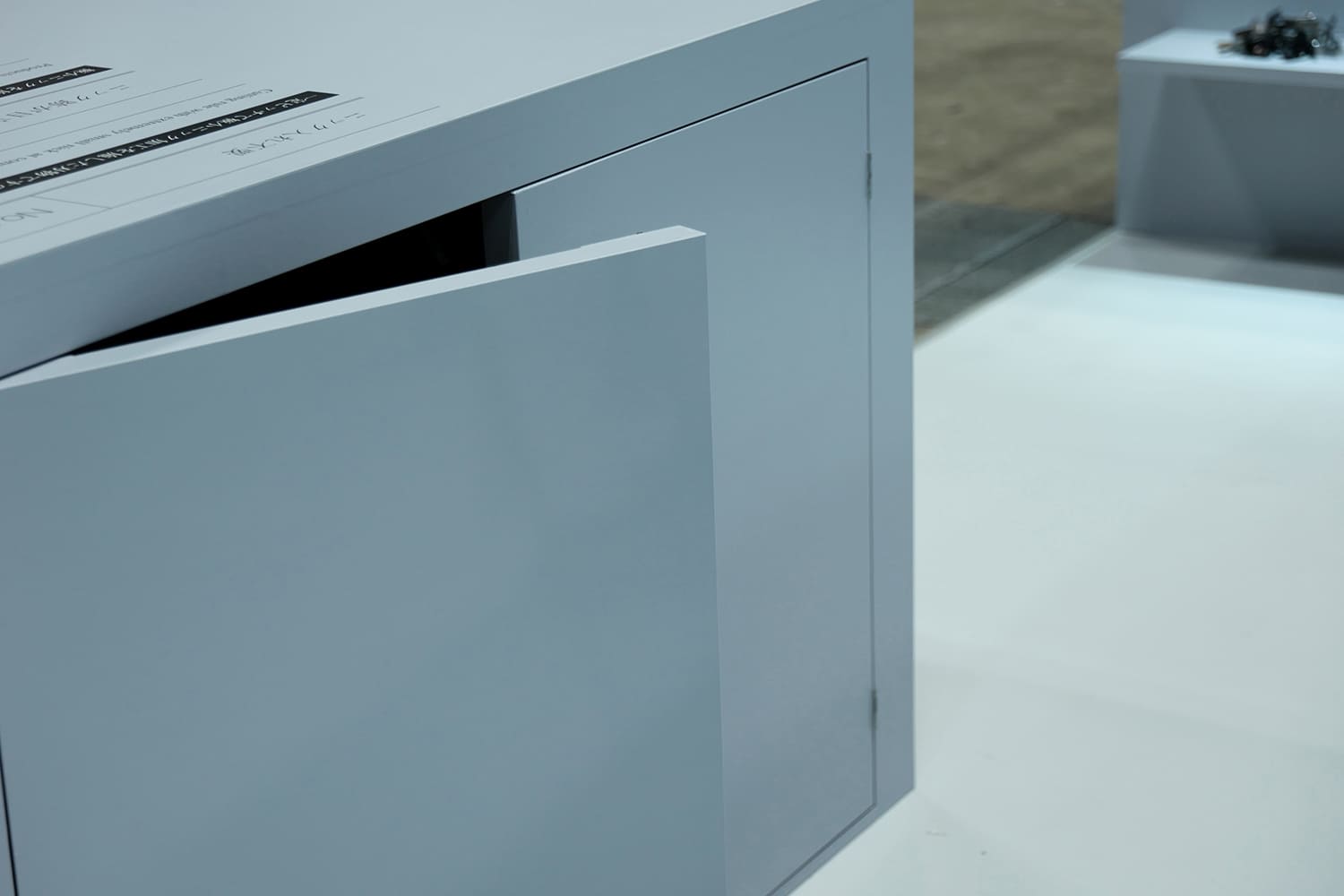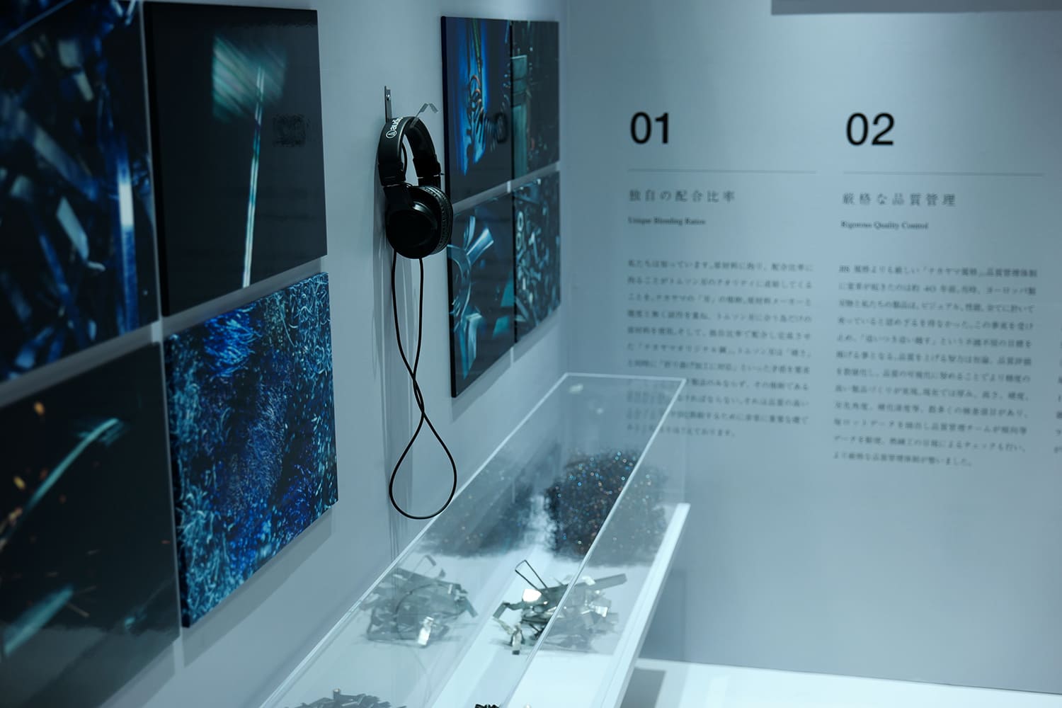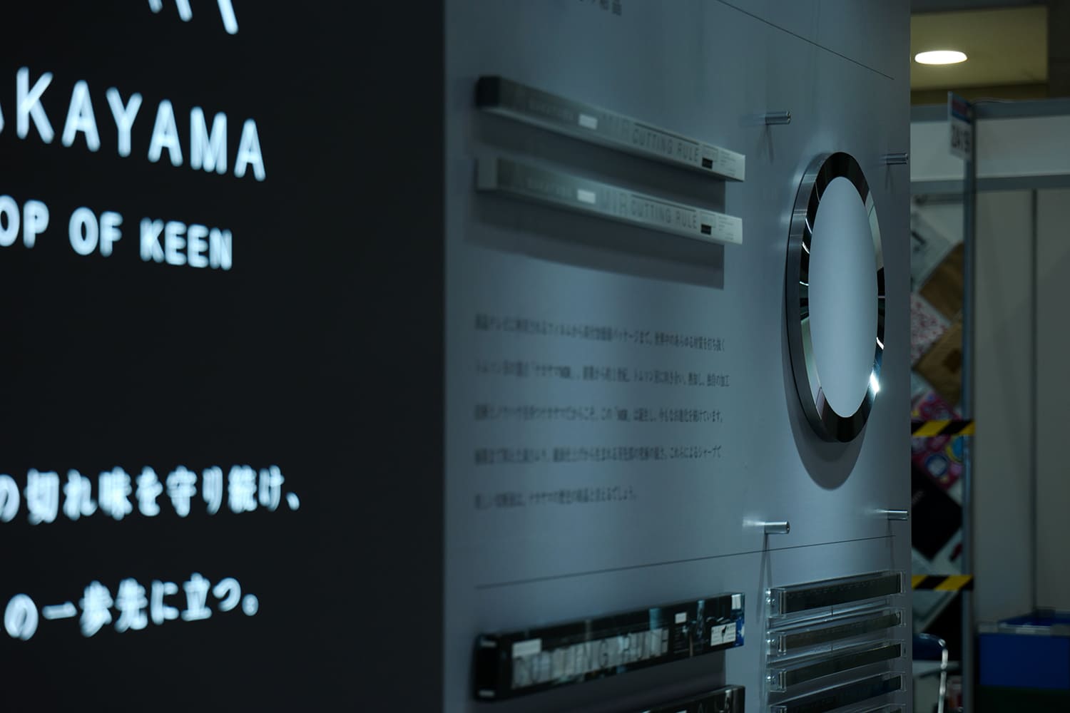 新製品である刃物が美しく収まるように台をくり抜き、2本だけ配置した。