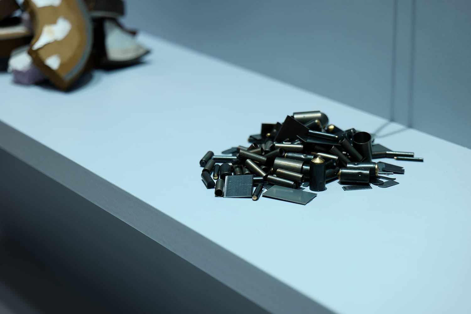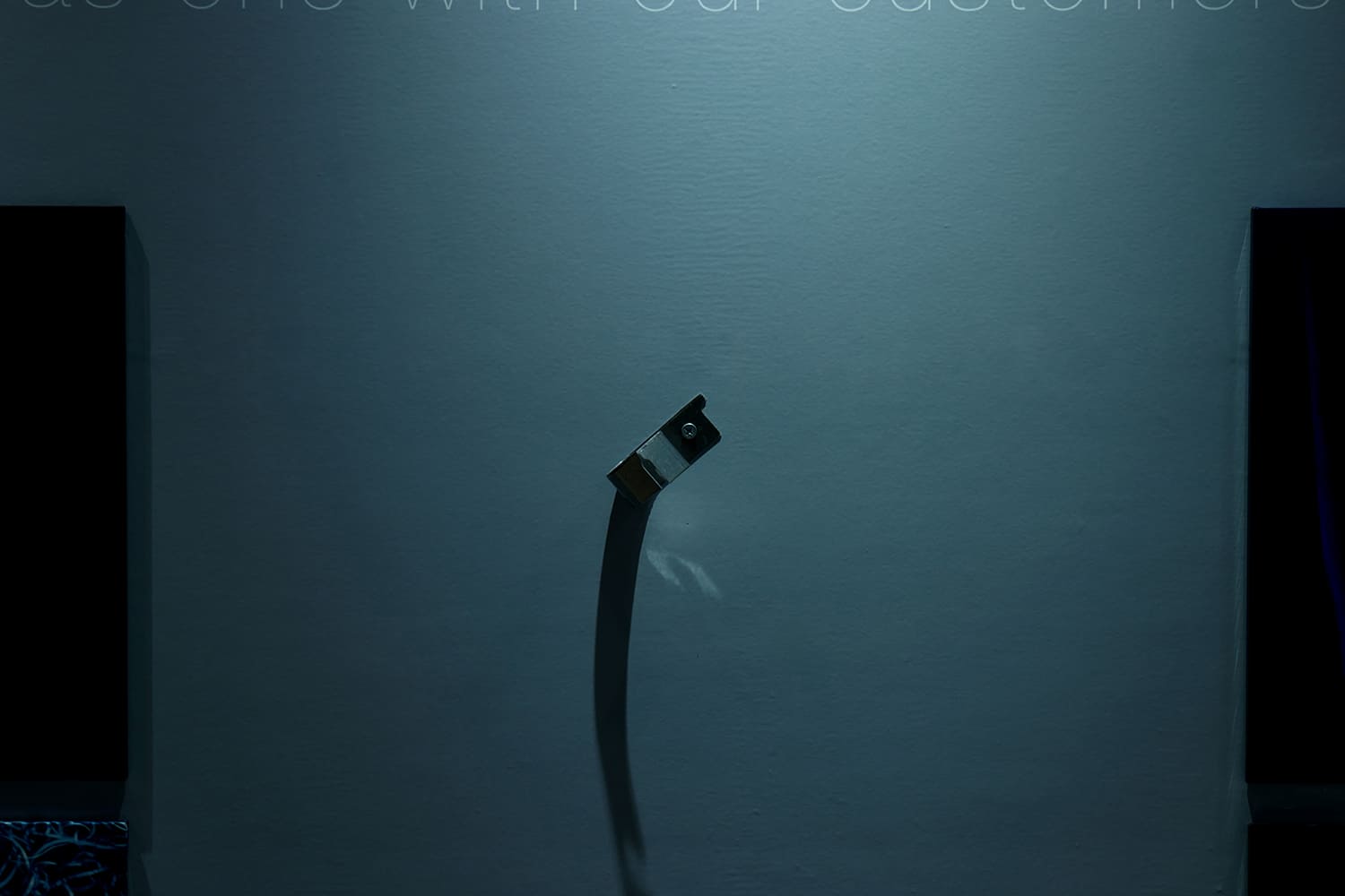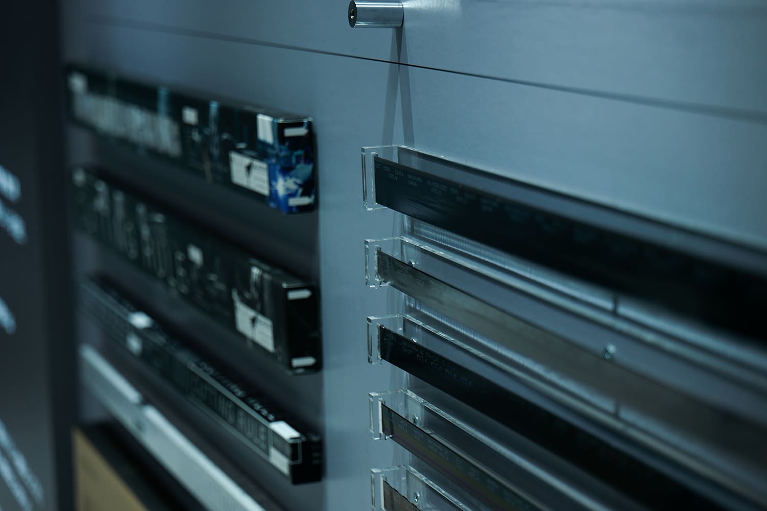 新製品である刃物が美しく収まるように台をくり抜き、2本だけ配置した。