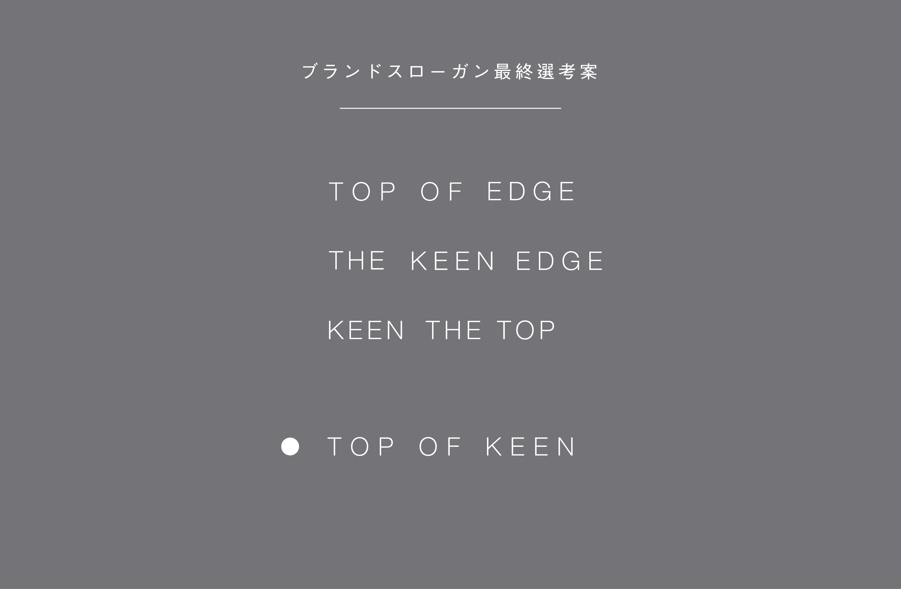 本スローガンである、「TOP OF KEEN」に到るまで様々なコピーを思案。