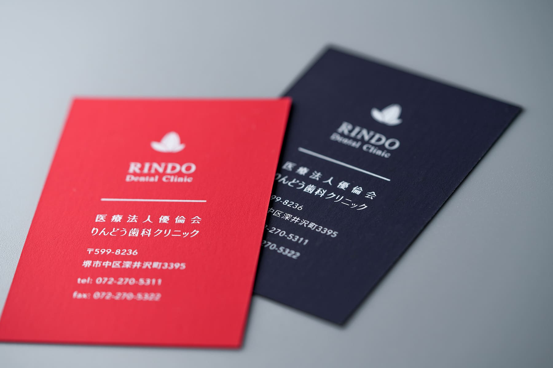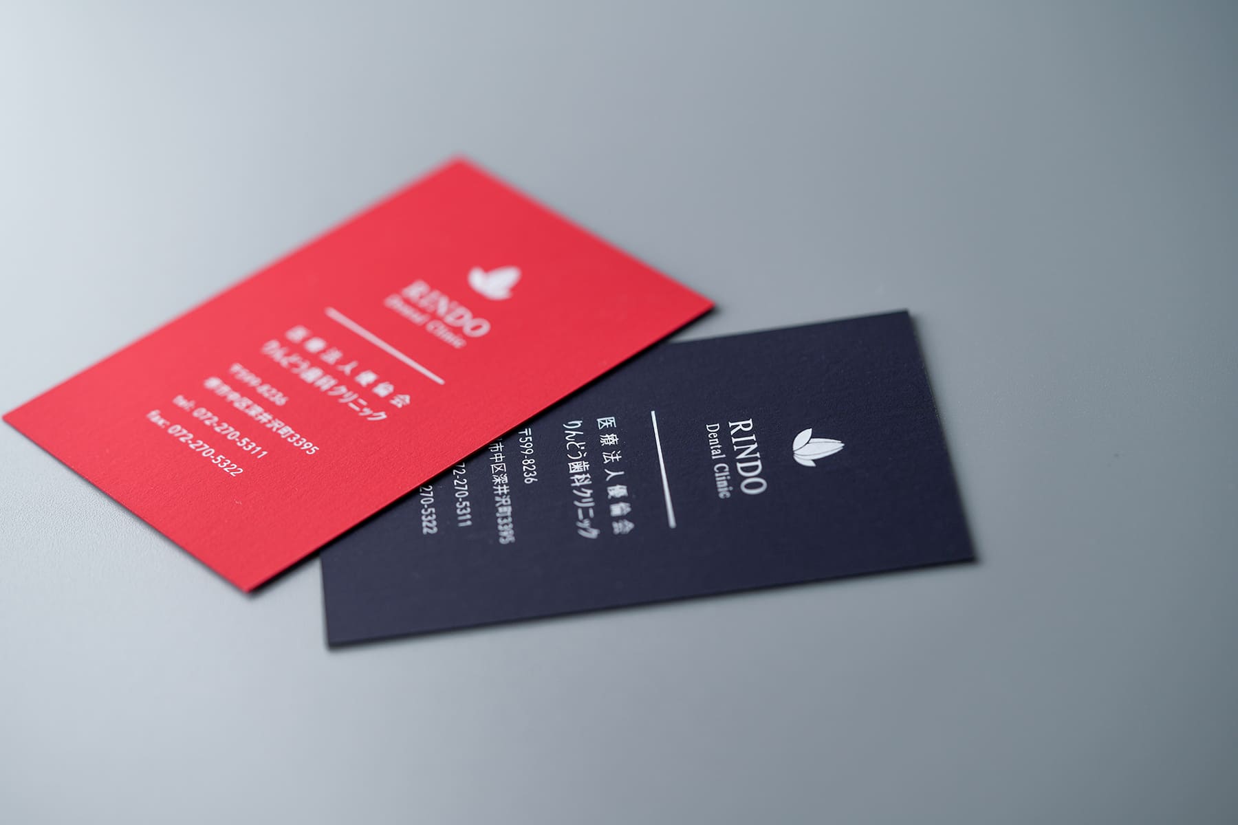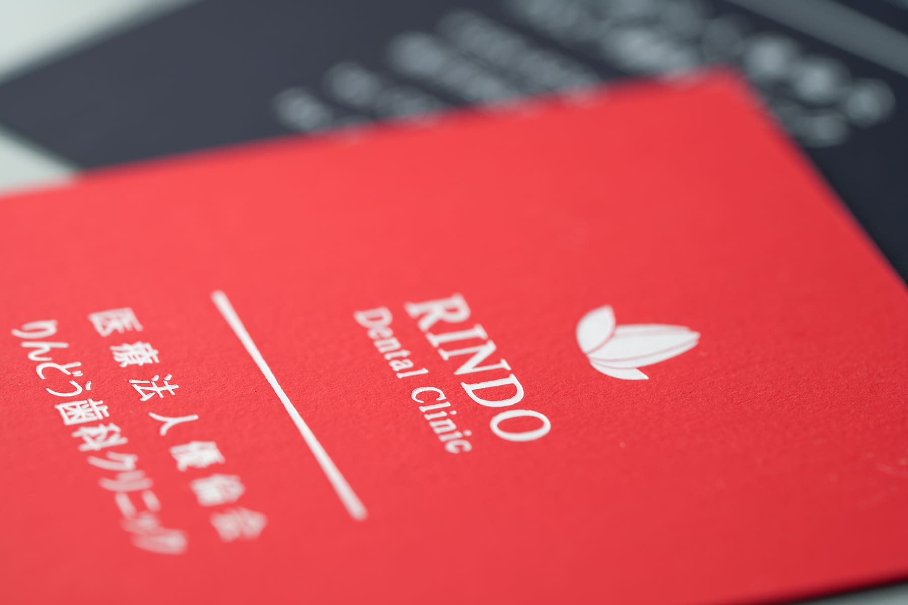 独創的な歯科医師の名刺。普通の紙に色をオフセットベタ塗りしてこのレッドとネイビーを出しているのではない。質感に触れた瞬間、わかる人にはわかるスペシャルな名刺。名刺とは不思議なもので、料理と同じく味わった瞬間に、良さがわかる人にはわかるものである。