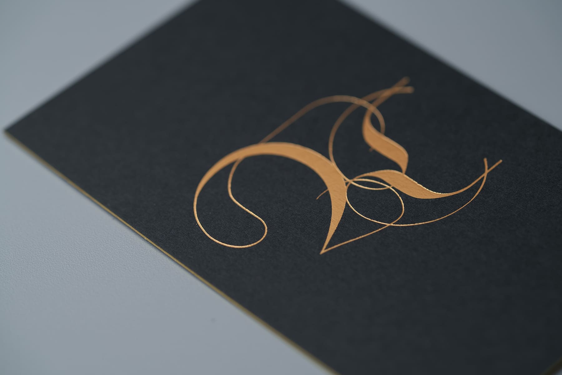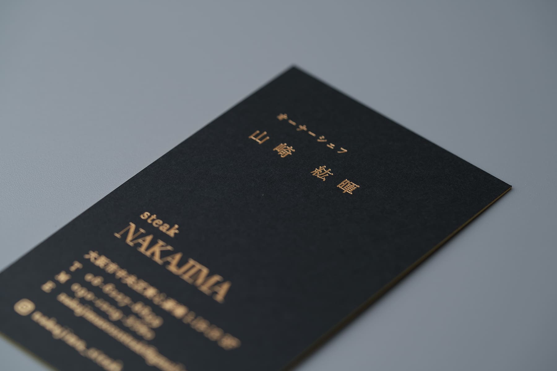 アイデンティティをどう捻出するか。真っ黒な上質紙に全面金箔+名刺の縁の部分も金で染めている特殊加工のオンパレードの様な社長名刺。