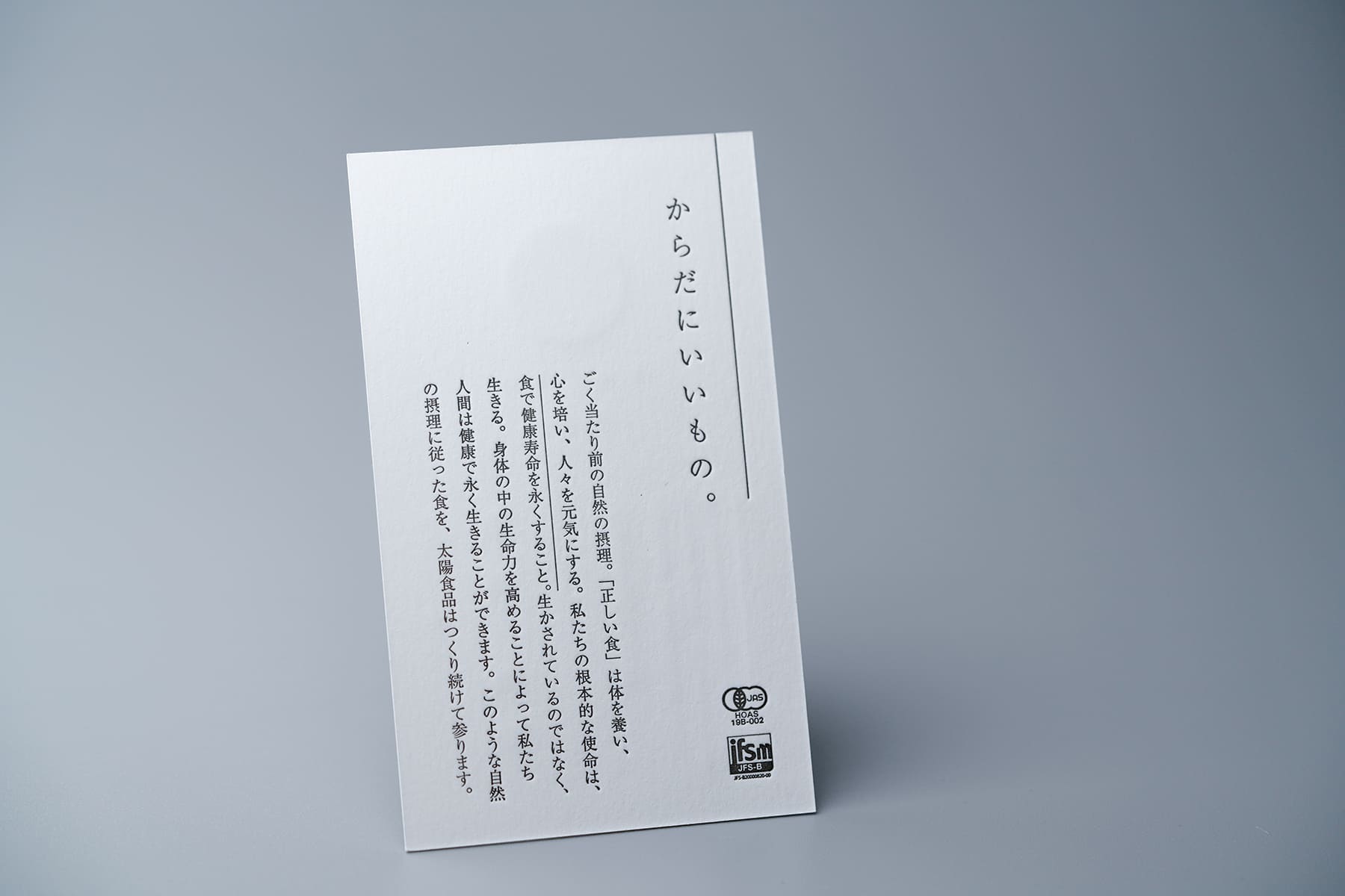 商品の魅力を煽り立てることはデザインの本質から遠ざかる。情報がノイズとなり過剰な表現は伝達力を結果弱める事となる。端的な哲学書を名刺代わりにしても良いのではないか。