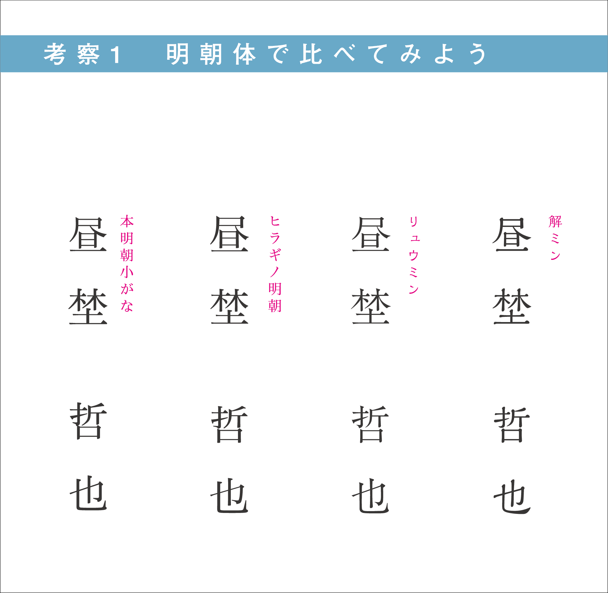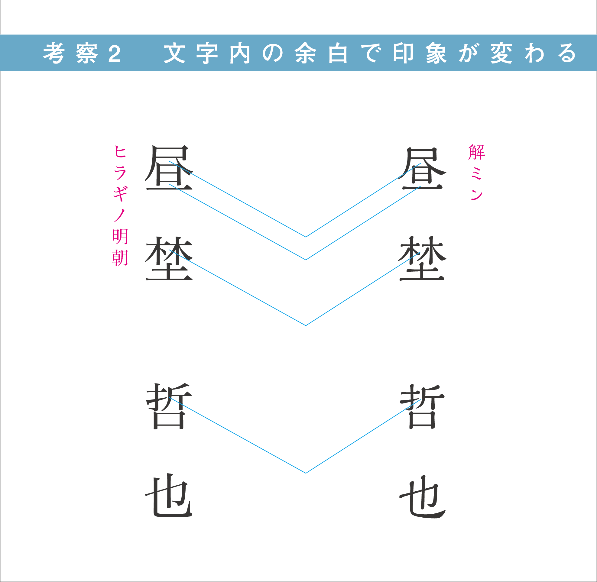 注目いただきたい部分は、それぞれの書体ごとの文字内の余白。ヒラギノと解ミンでは余白の取り方が全く違います。ヒラギノは窮屈な文字の成り立ちをしている。逆に解ミンは余裕のある文字の取り方をしている。デザインは細かいディティールの連続体なので、この余白が余裕な書体の集合体をマクロで見ると「堂々としたイメージ」に繋がるのである。