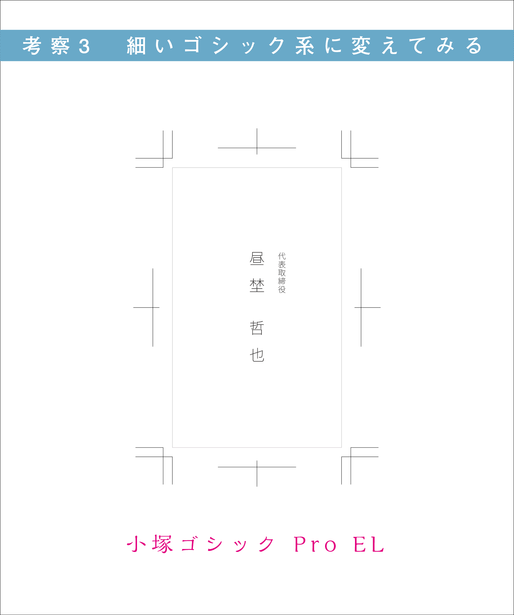 今回この社長名刺に使用したものは、「解ミン」と呼ばれる明朝体に隷書の筆法を取り入れた漢字と、活字時代の筆の運びを感じさせるデザイン書体です。 ヒラギノ明朝、リュウミン、新聞明朝、Ro本明朝小がな等の明朝体にするといかにも社長感が出てしまい、少々固いイメージになってしまう。 何を選ぶかは最終デザイナーのセンスに委ねる形となる。だからこそクライアントの求めているものを汲み取る力と形へ可視化する力が重要である。