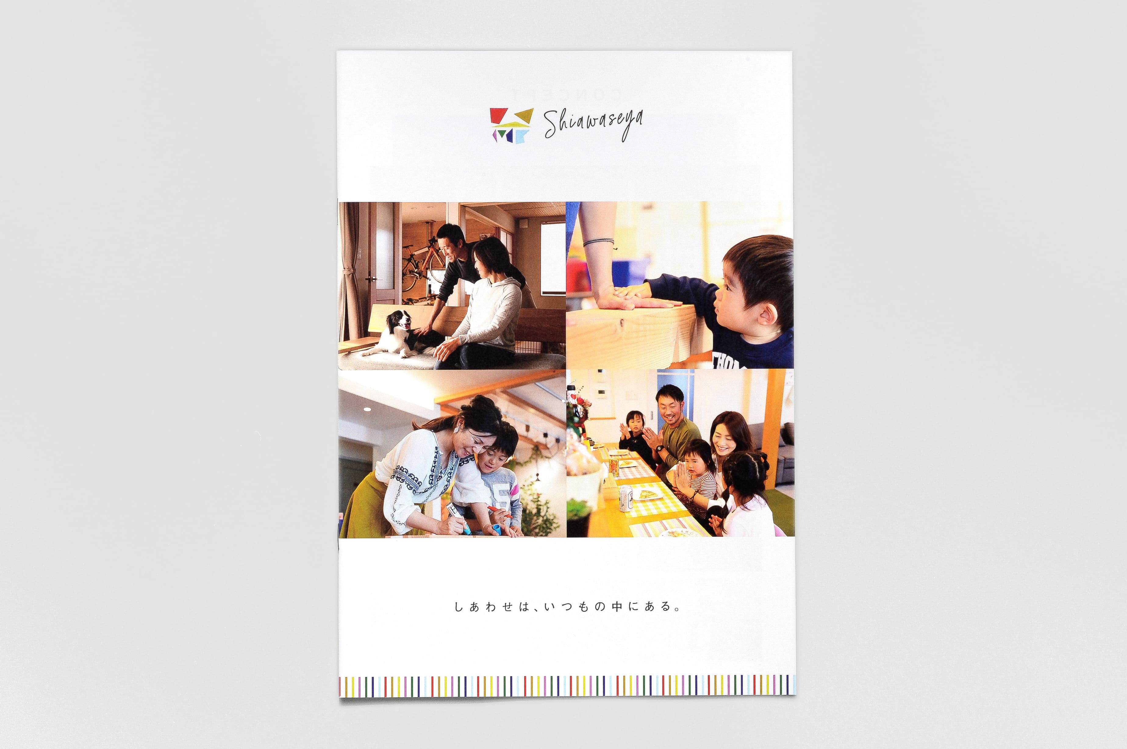 家づくりはドラマのようで、 お客様の数だけ美しいものがたりがあります。 その十人十色のドラマを捉えた人情味のある写真をベースに、 幸せの象徴でもある虹色のポップなおしゃれカラーでデザインしました。