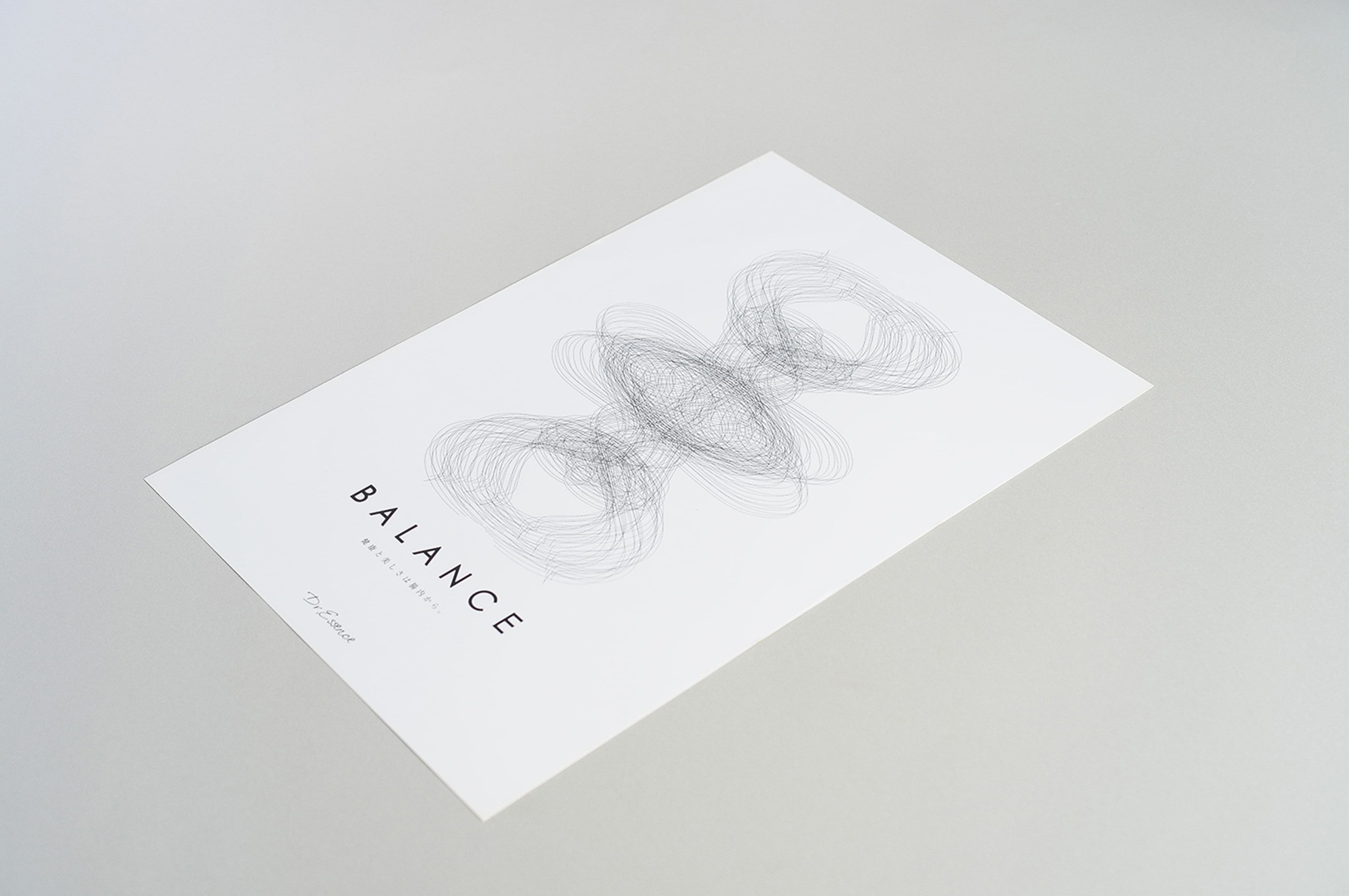 シンプルでアートなブランドイメージアップのフライヤー。おもて面の抽象的なシンボルは人間の体内を様々な栄養素が巡り、カラダを内から整えているようなイメージ。シンプルに白と黒のモノトーンでデザイン。