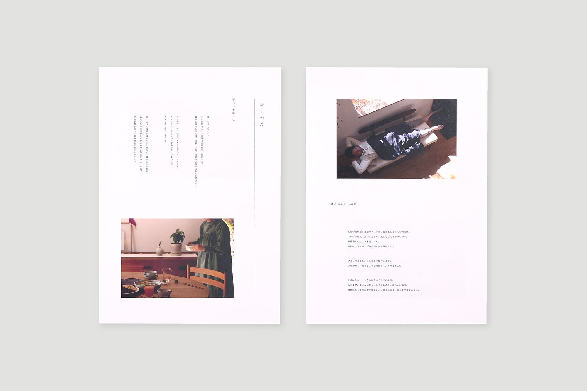建築事務所様の案内パンフレット。その土地に差し込む「光」や「風」を感じながら家屋の設計を行うという、建築士様の思想を反映いたしました。冊子ではなく、あえて1枚ずつ。しっかりとゆとりを持って。一つ一つの言葉を大切にしながら丁寧に紡いでいく様な、穏やかな空気の流れるパンフレットに仕上げました。建築事務所様の持つ他には無い個性を表現したデザイン。