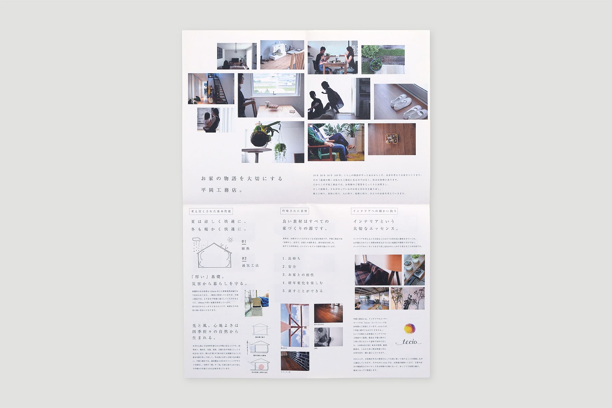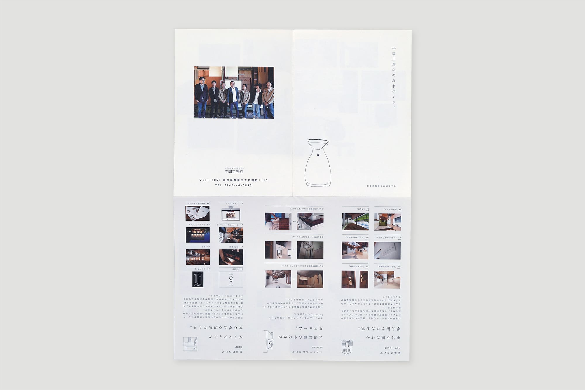 奈良の工務店様のパンフレット。横開きの冊子ではなく、折り込み型にすることで「開いていく」というギミックが楽しめる仕様に。読者に情報を届けるという目的を達成する手段は幾つもございますが、こちらの折りパンフレットでは開いていく楽しさで最後まで読ませるデザインを採用しました。折り込まれたページを開く毎に新しい世界が飛び込んでくる、ワクワクする仕上がりです。
