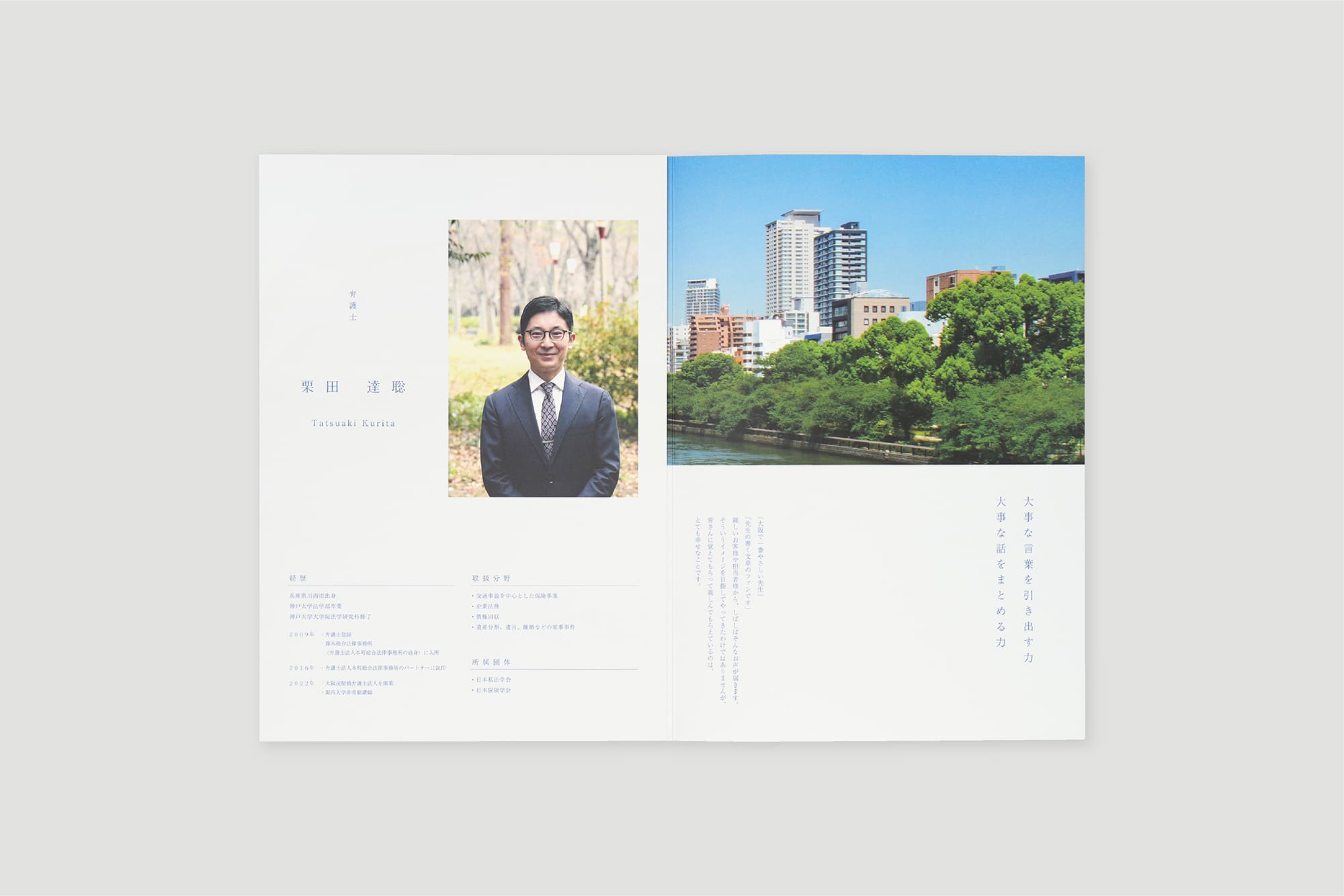 弁護士様のパンフレット。士業といえば固い印象がございますが、一つ一つの言葉、物語、美麗な写真を駆使し、柔らかなお人柄も伝わるような一冊に仕上げました。 伝えたい情報がしっかりと伝わる「機能的」なデザインであることは大前提です。「情緒的にも響く」ことを重視したこちらの弁護士様のパンレットは、より見る者の記憶に残る一冊となるでしょう。