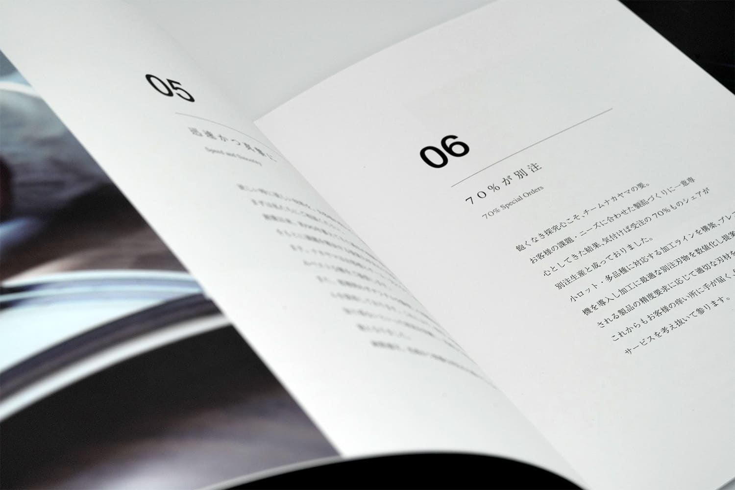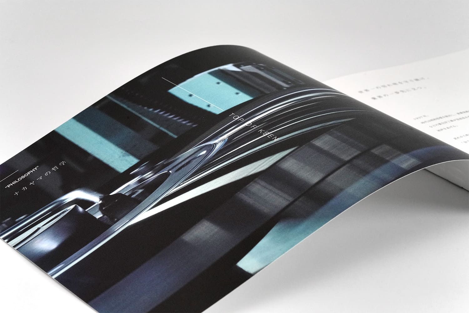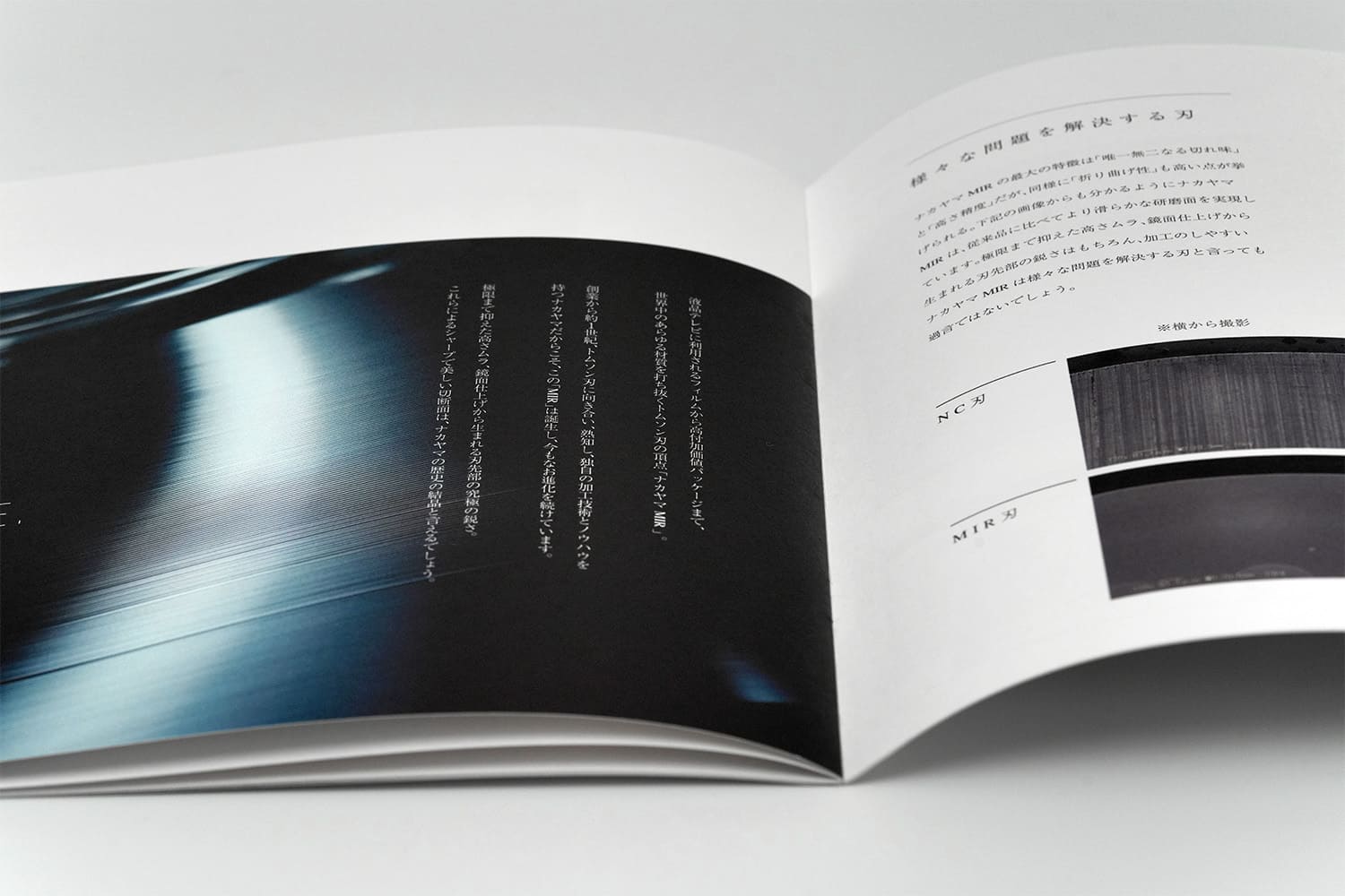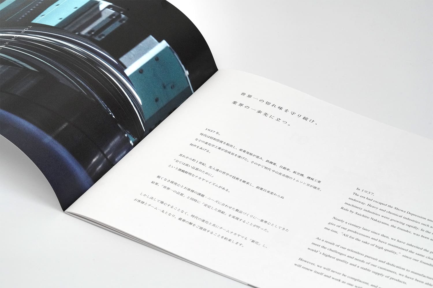 1937年創業。約1世紀にわたり世界一の品質でトムソン刃を製造し続けてこられた、株式会社ナカヤマ様の会社パンフレット。表紙に据えられた銀に光輝くロゴマークによって、一瞬にして世界観に引き込まれます。美しい写真と研ぎ澄まされた言葉の一つ一つがイズムを体現し、正に会社の分身体の様な一冊となるようデザインしました。