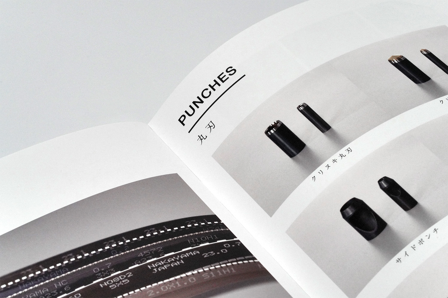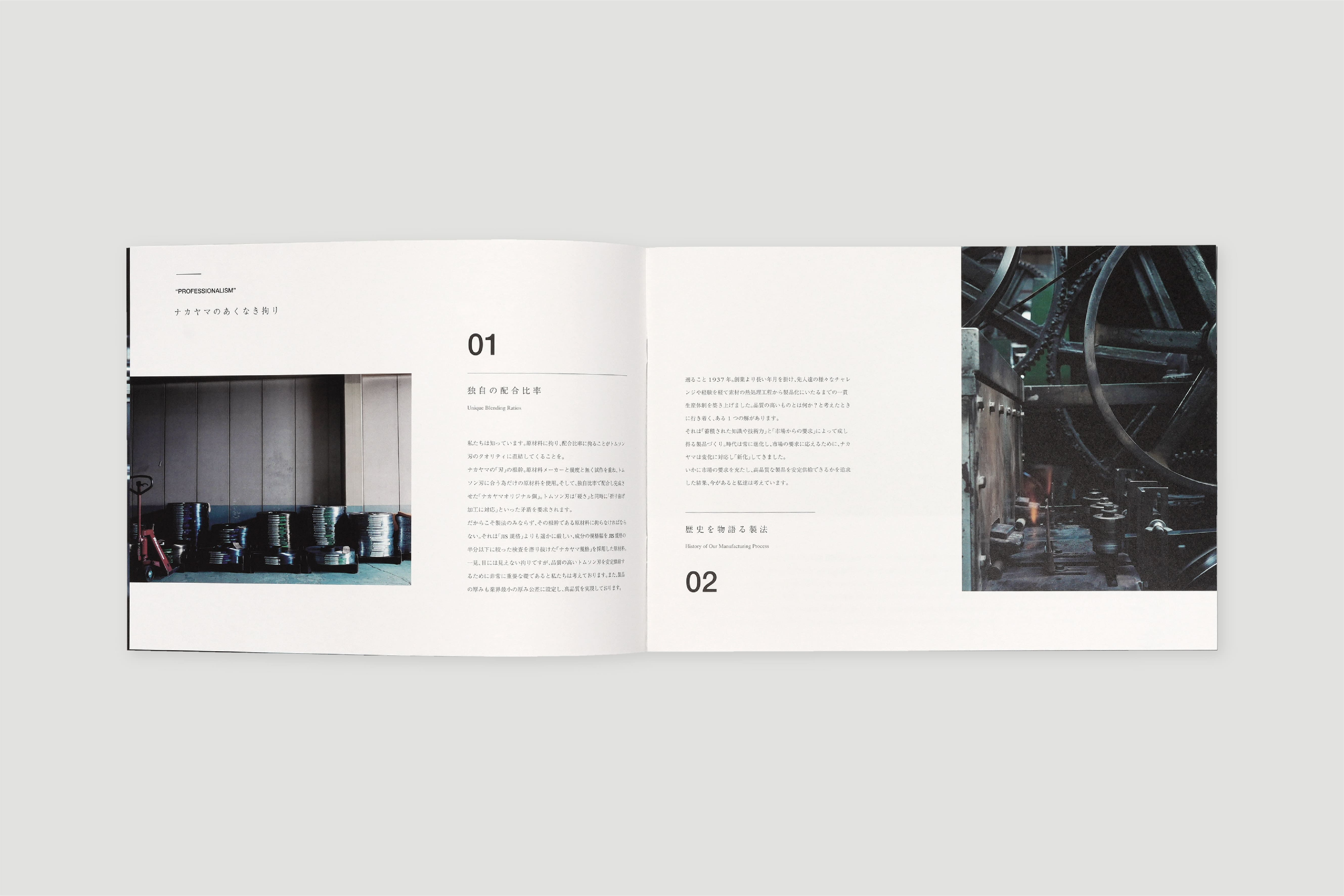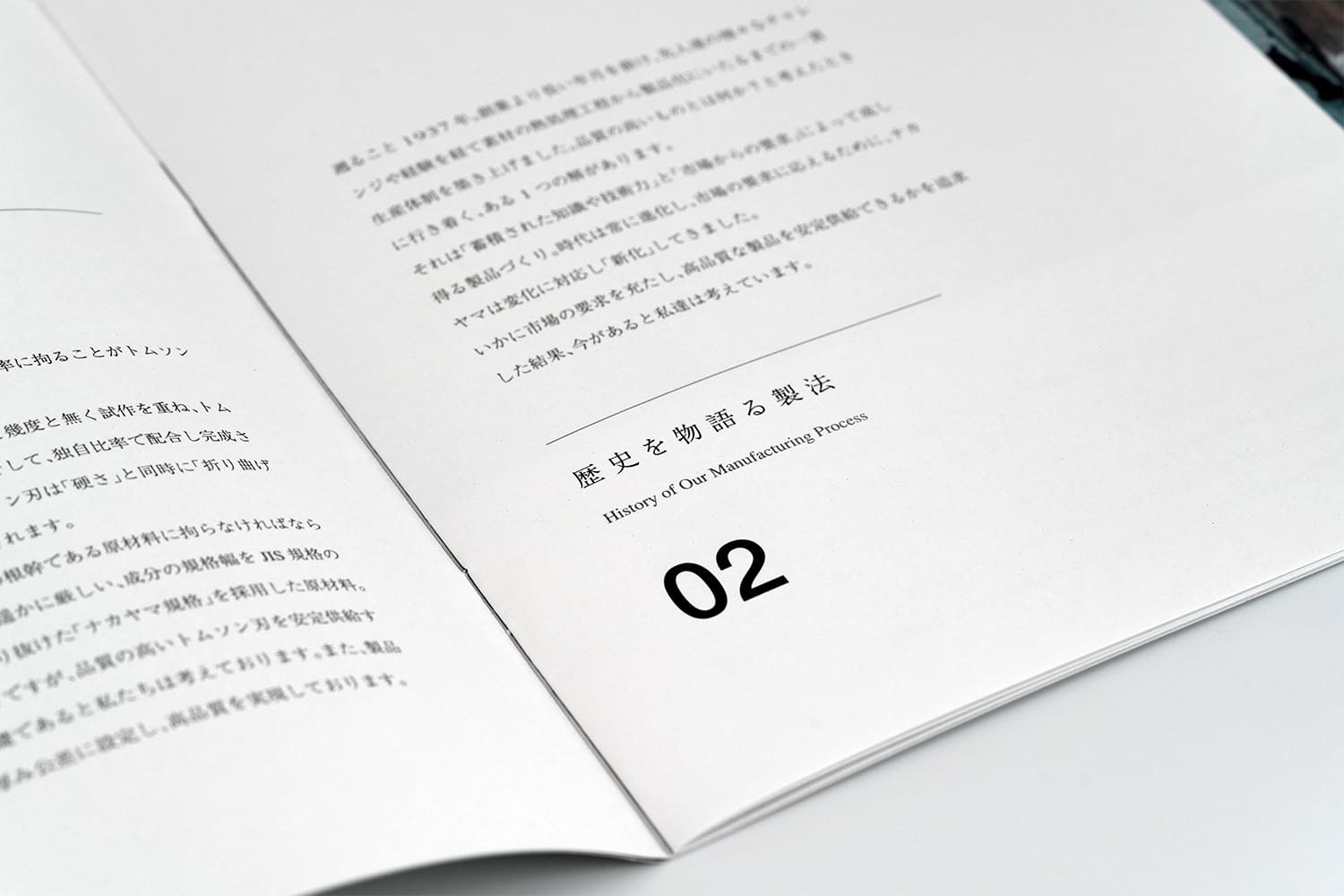 1937年創業。約1世紀にわたり世界一の品質でトムソン刃を製造し続けてこられた、株式会社ナカヤマ様の会社パンフレット。表紙に据えられた銀に光輝くロゴマークによって、一瞬にして世界観に引き込まれます。美しい写真と研ぎ澄まされた言葉の一つ一つがイズムを体現し、正に会社の分身体の様な一冊となるようデザインしました。