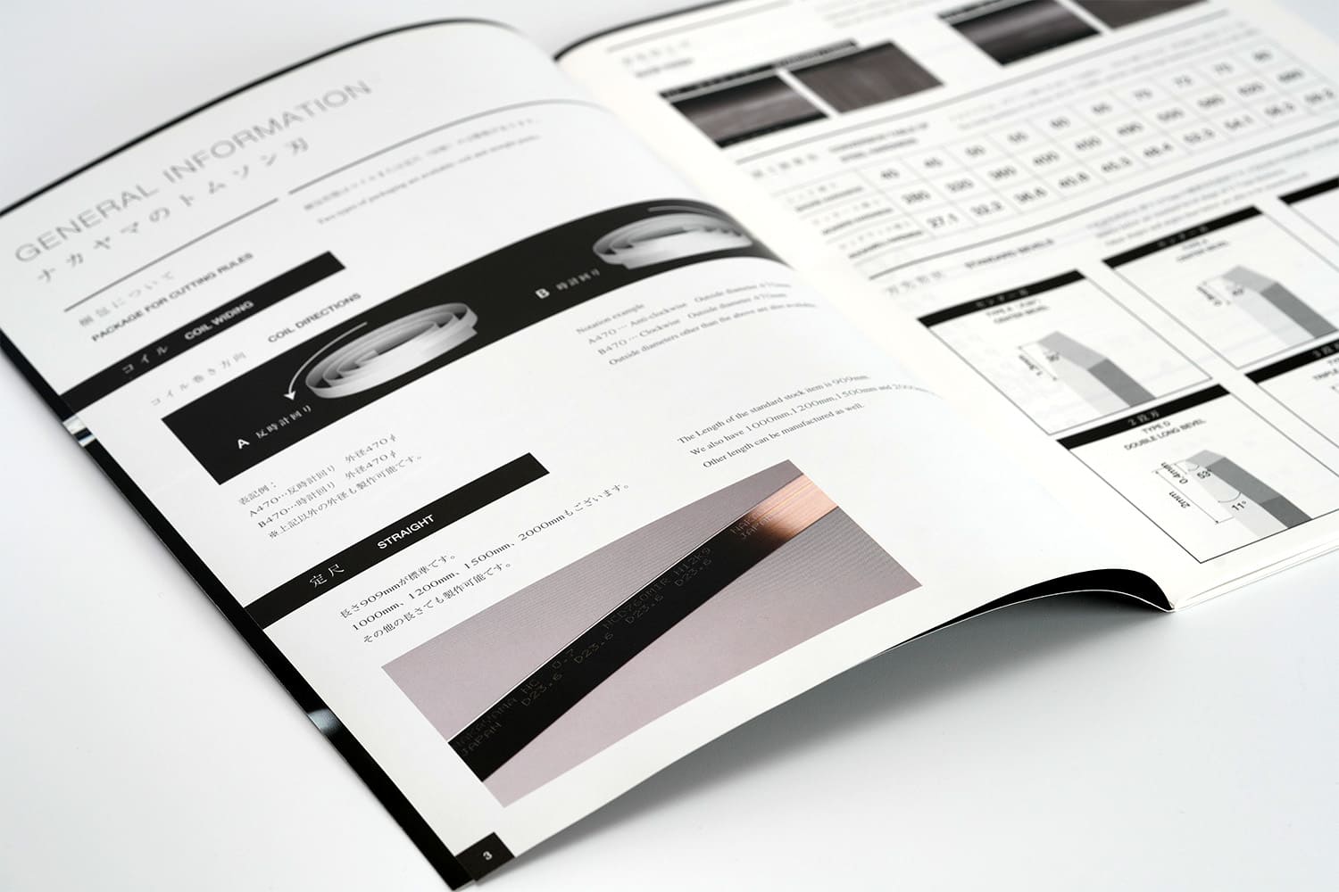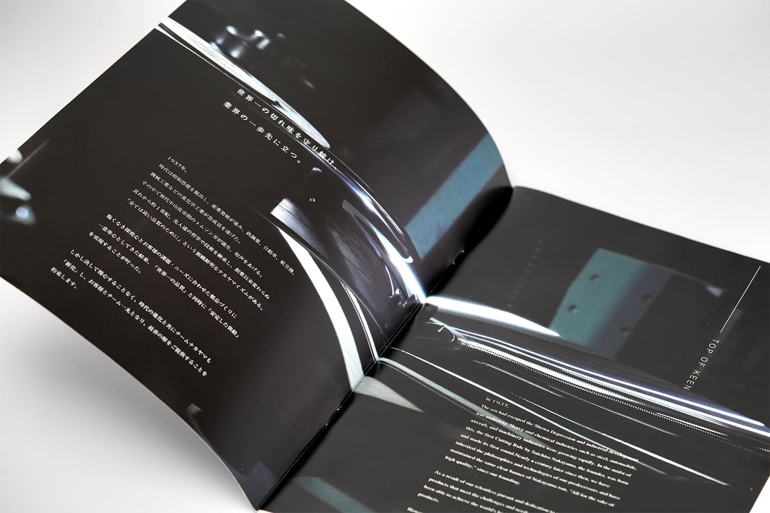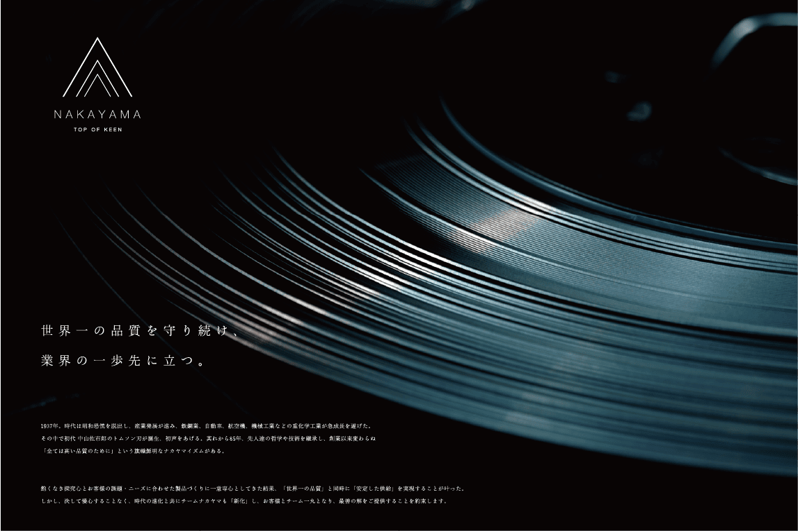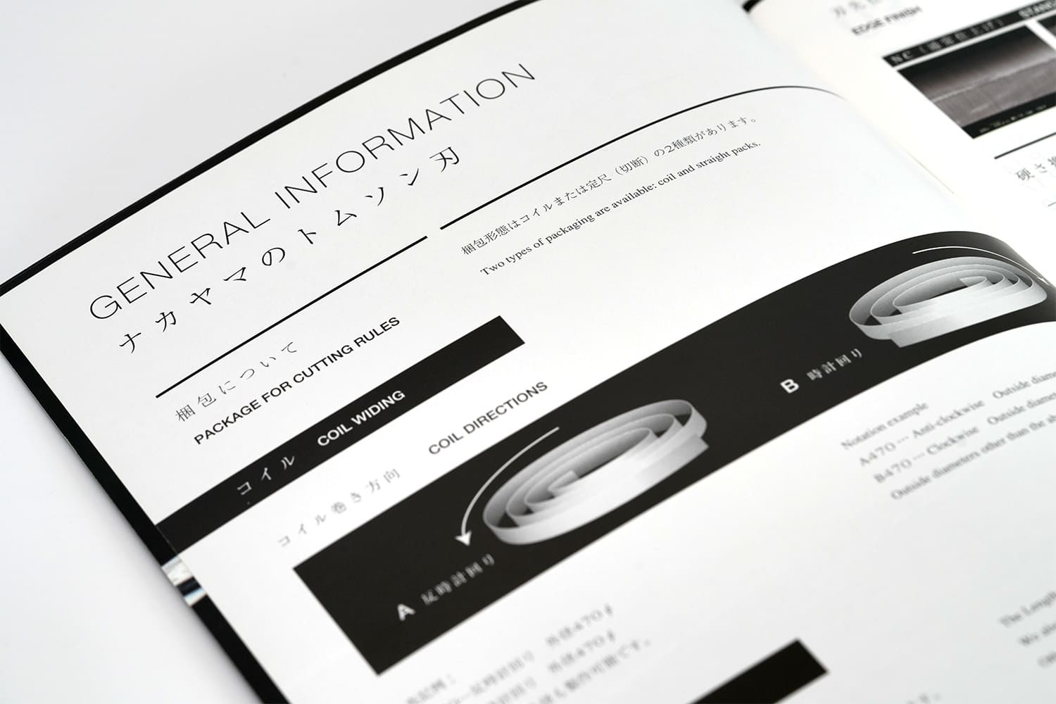 1937年創業。約1世紀にわたり世界一の品質でトムソン刃を製造し続けてこられた、株式会社ナカヤマ様の製品カタログ。ラインの太さ、テキストの大きさ、余白のバランス、ひとつひとつのあしらい、細部に至るまで徹底してこだわり抜き、只々製品を羅列するだけの一般的な製品カタログとは一線を画す美しいデザインに仕上がりました。また随所にイメージカットを配置することで、製品だけでなく世界観にも浸ることのできる一冊。