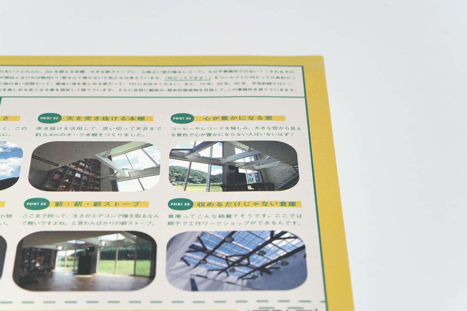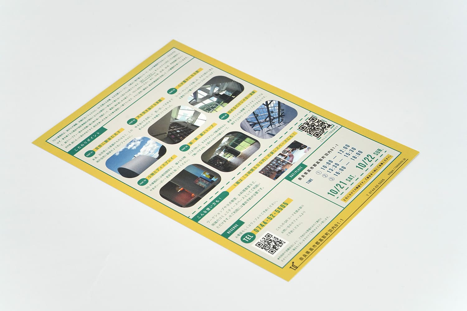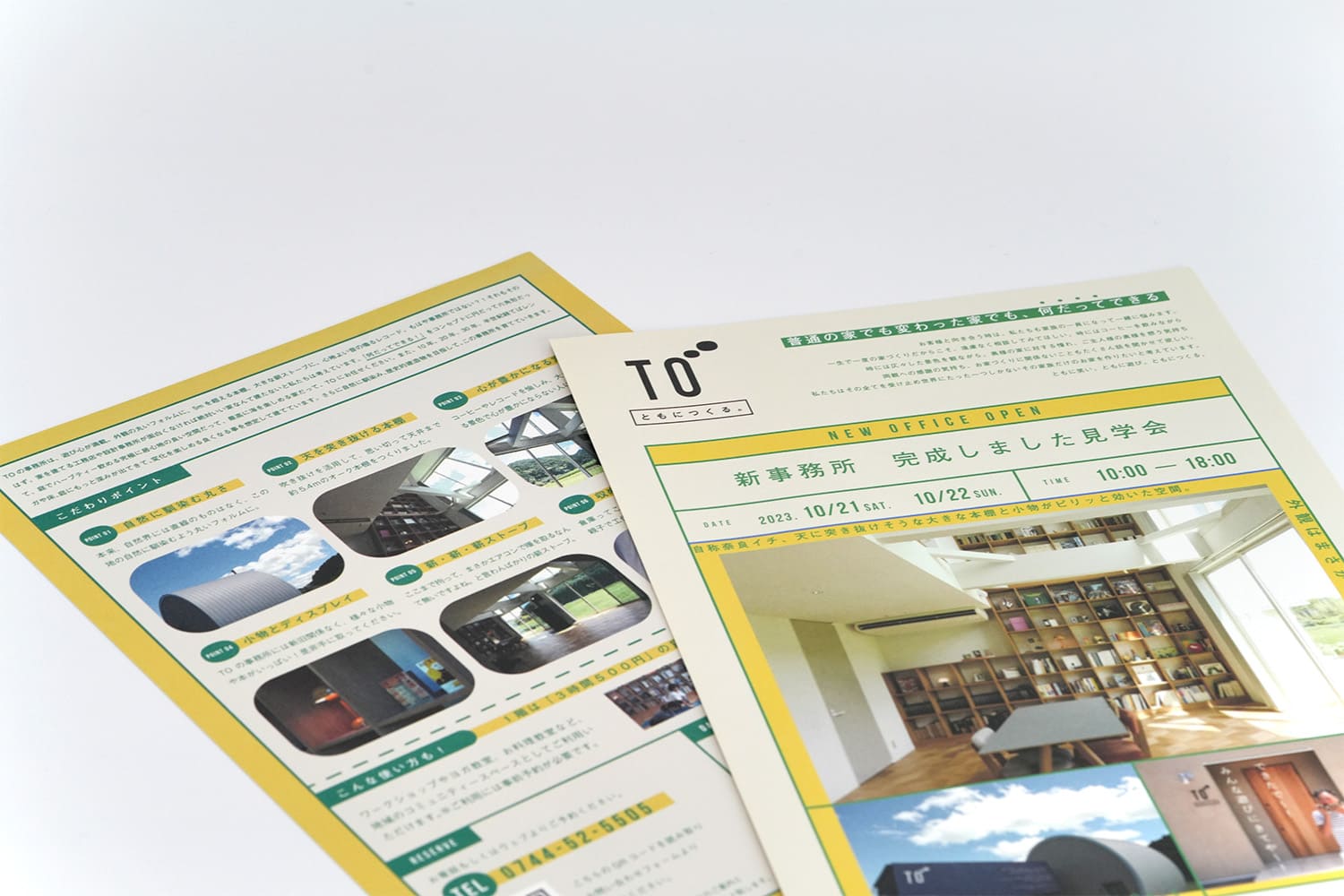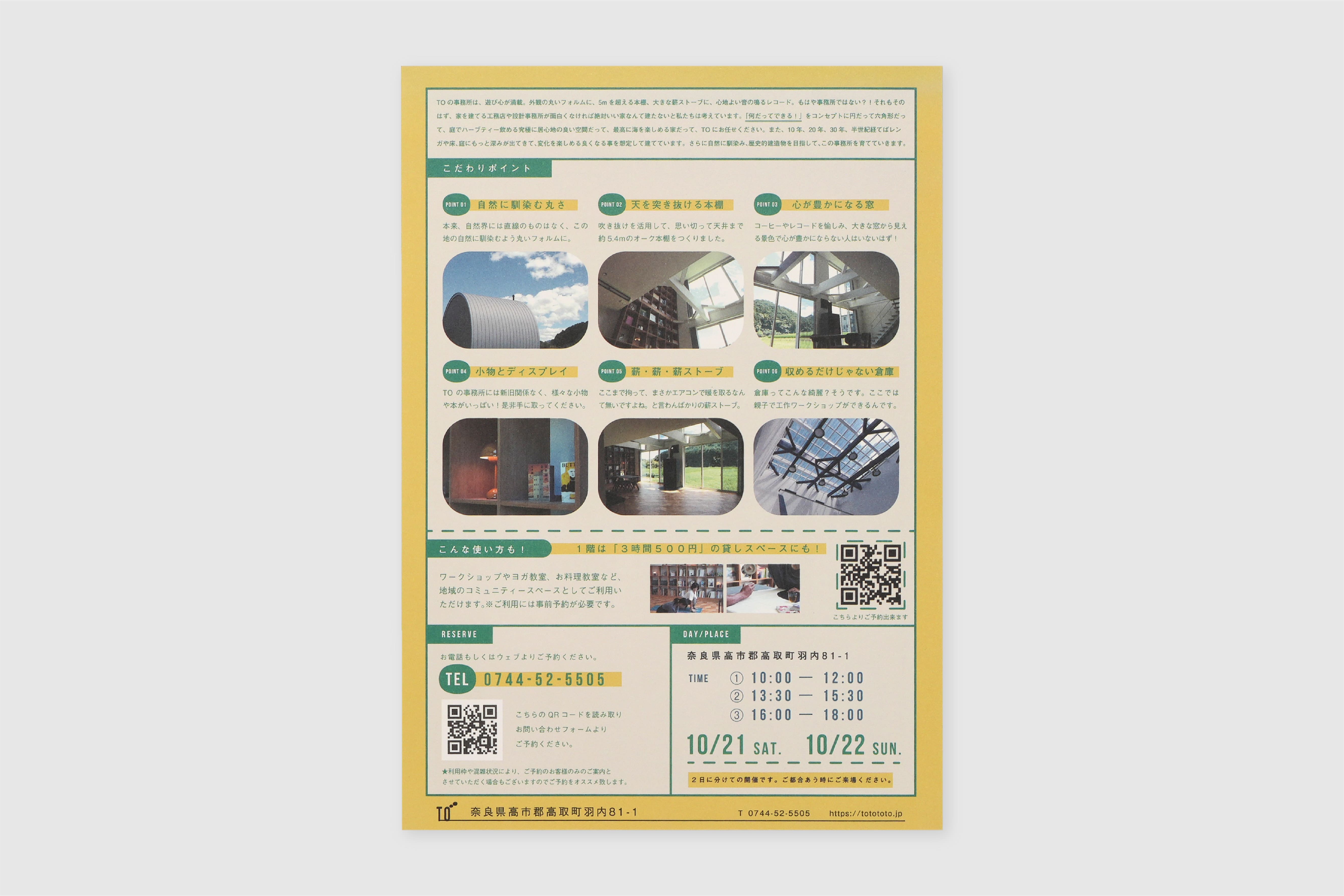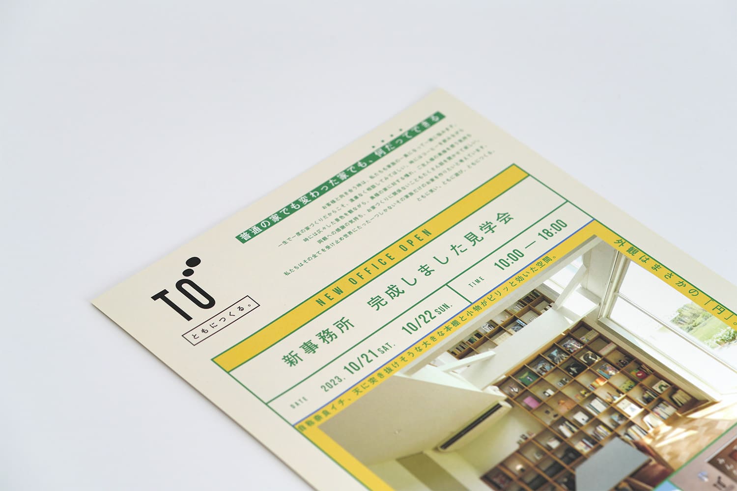 奈良の工務店様の、事務所完成見学会フライヤー。色使い、あしらい、レイアウト、言葉の一つ一つに至るまでブランドの個性を詰め込み、見ているだけでワクワクする様な世界観に仕上げました。「楽しそう」「イベントに参加してみたい」と感じてもらえると同時に、ブランドの世界観にも浸っていただけます。