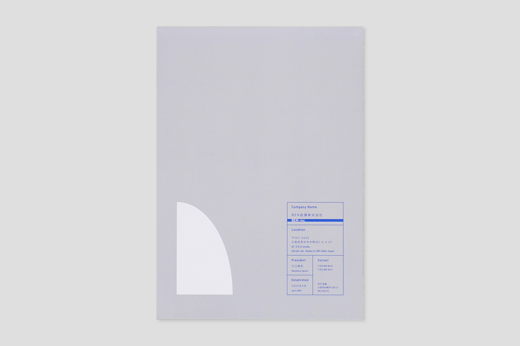 表紙のロゴマークが印象的な、少し変わったパンフレット。パンフレットの作成において最も重要なことは「何を伝えたいか」という軸を定めることです。こちらはロゴ以外の情報を思い切って削ぎ落とし、会社名とその顔であるロゴマークを覚えてもらうことに振り切ったデザイン。中ページも極力情報量を抑えているので、相対的に「本当に伝えたいこと」が際立つよう設計致しました。情報量が盛り沢山の一般的なパンフレットに比べると少々変わった佇まいですが、機能性は抜群です。