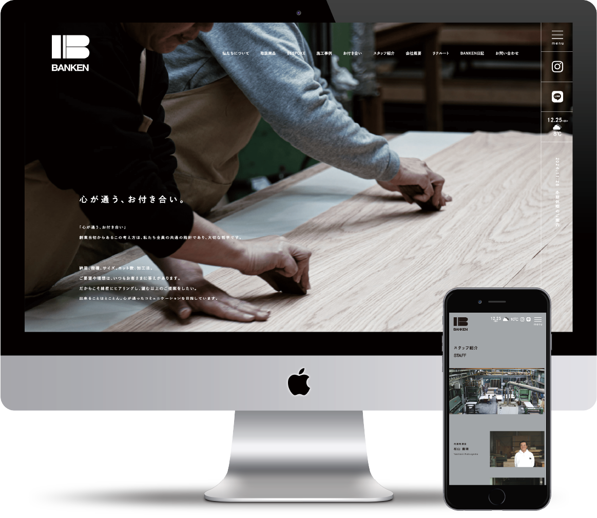 「心が通う、お付き合い」という哲学のもと常にお客さまに寄り添いながら、熟練の職人による高い技術力で高品質な突板をつくり続けてこられた万代建材様。創業当初からあるこの哲学を軸としてデザインに落とし込み、完全なるブランドの世界観を作り上げた。