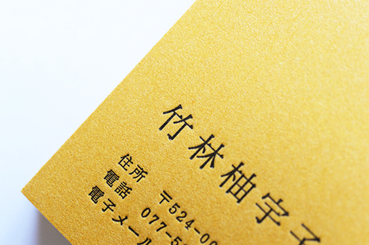 生成り色の紙に活版印刷で、優しく温かい雰囲気に。墨一色では真面目で誠実な印象となりますが、ゴールド系カラーを差し色として使用することで、優しさの中にも誠実さやエレガントさを感じるお名刺に仕上がりました。
