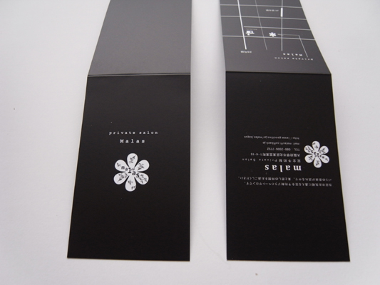 短辺に折り加工を加えた、二つ折りの中でも珍しいショップカード。貰うとなんだか嬉しくなってしまう可愛らしさです。