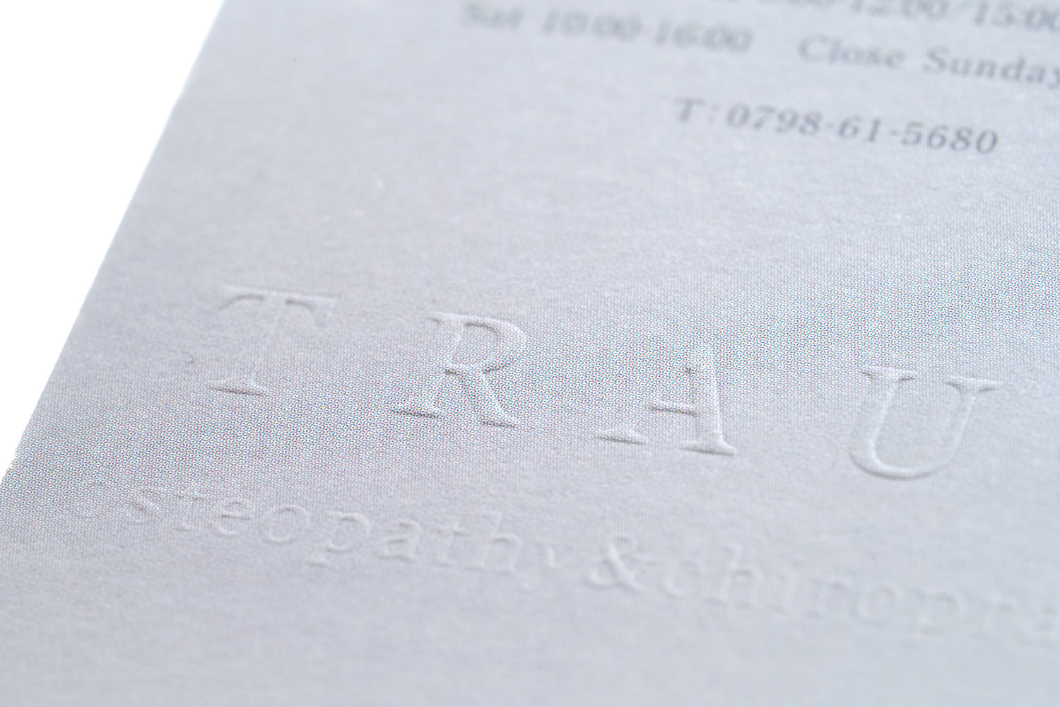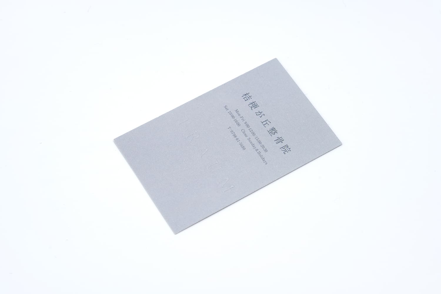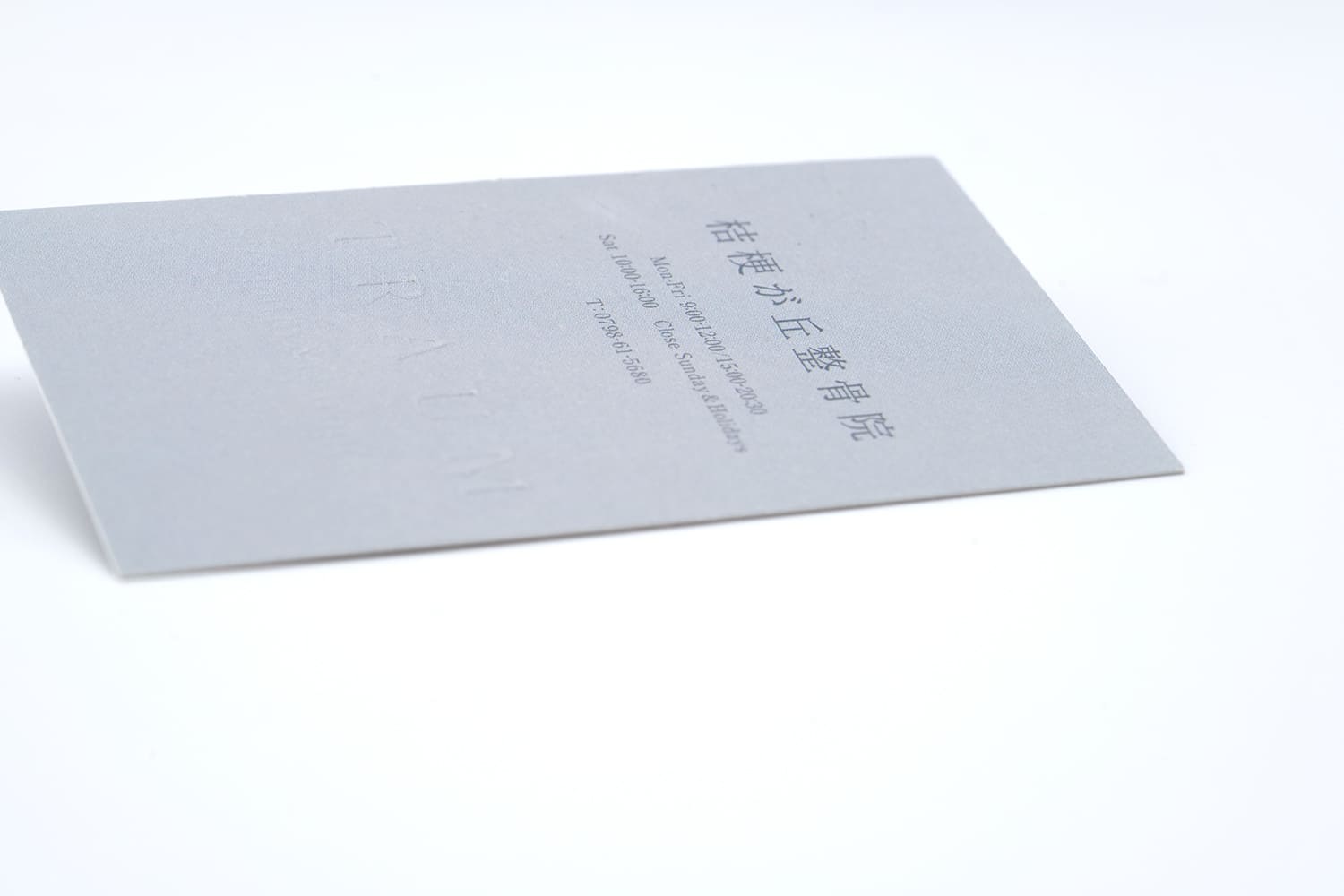 整骨院様のお名刺。熟練した職人の技巧により、とても繊細なセリフ体をエンボス加工で表現。触れるとはっきり伝わるその細やかな質感は、圧倒的な美しさと存在感を感じさせます。