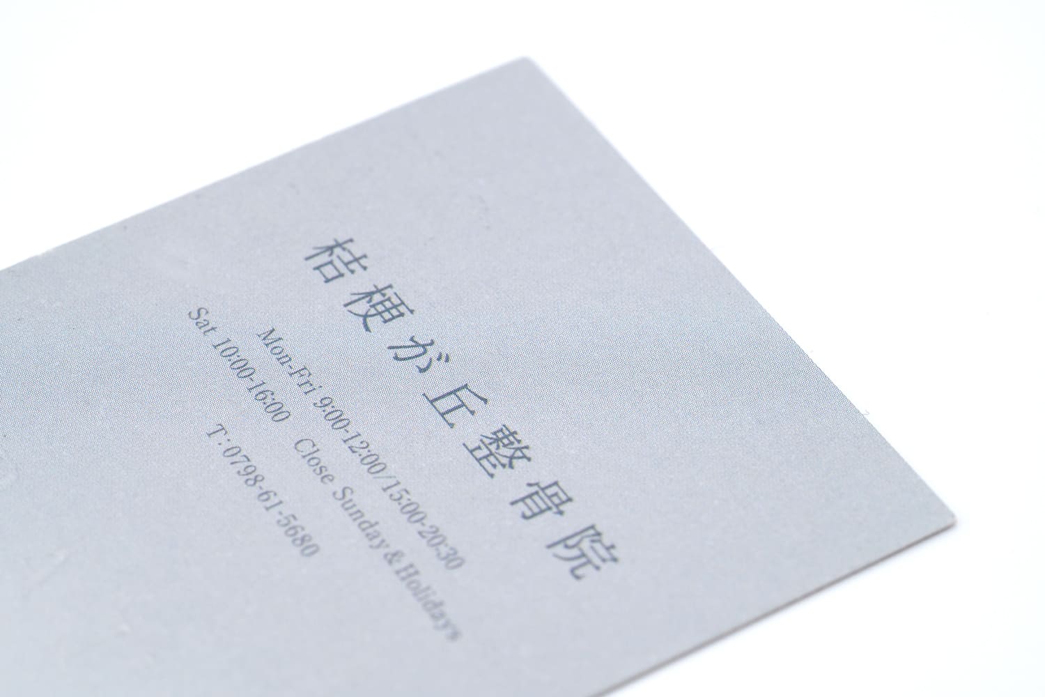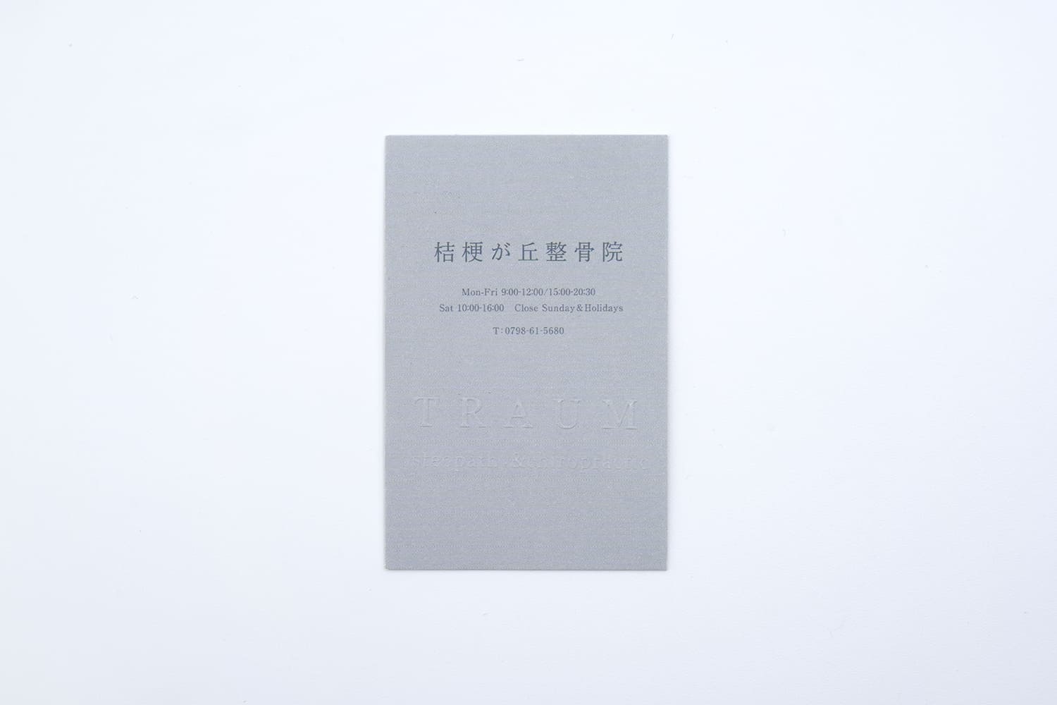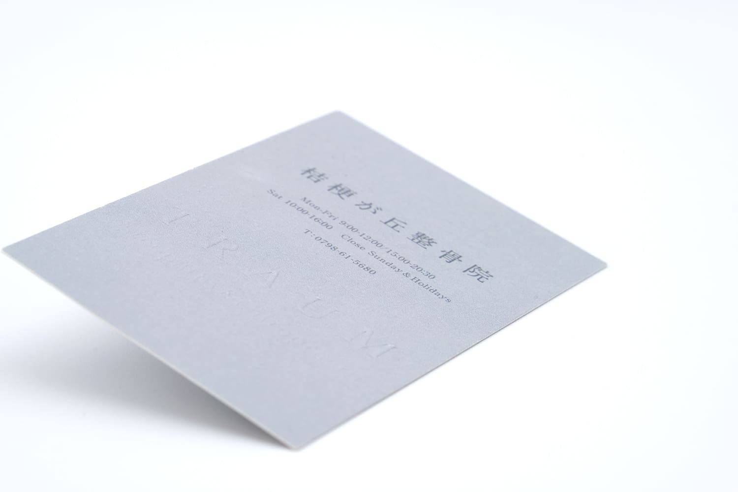 整骨院様のお名刺。熟練した職人の技巧により、とても繊細なセリフ体をエンボス加工で表現。触れるとはっきり伝わるその細やかな質感は、圧倒的な美しさと存在感を感じさせます。