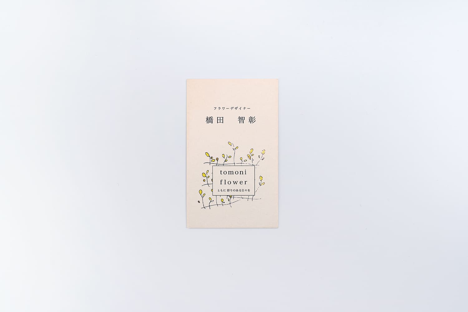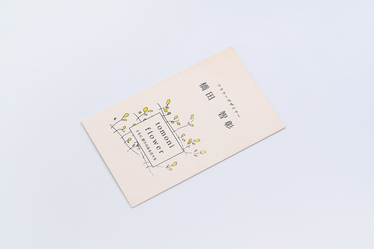 柔らかな表情のハーフエア紙と可愛らしいイラストが、親しみやすい空気感を演出します。ひと口にフラワーデザイナーと言っても、「洗練された美しさ」や「親しみやすい柔らかさ」など打ち出したいイメージは様々。紙、イラスト、レイアウト、加工、言葉、あらゆる要素を駆使してクライアント様にぴったりのお名刺をご提案致します。