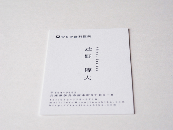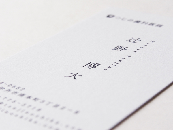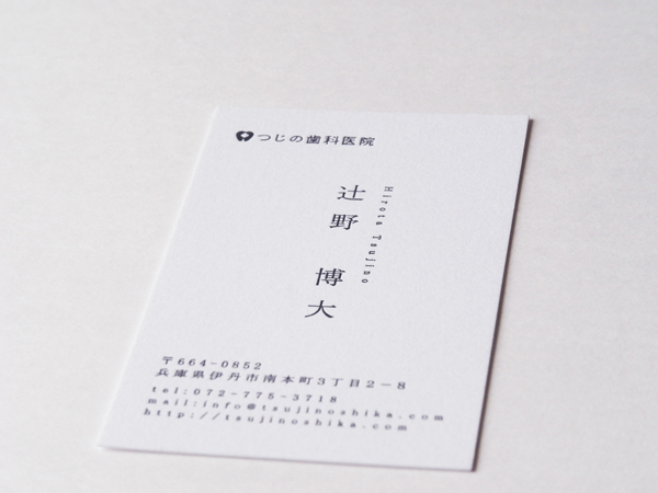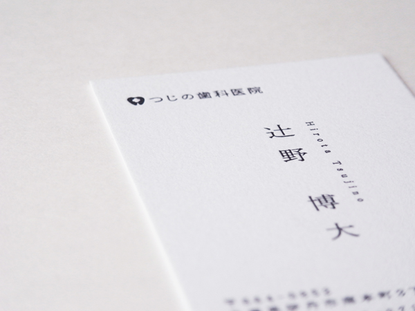 自分自信を映し出す”鏡”となる名刺。責任感ある誠実な人間なのか、はたまた信頼に欠く頼りない人間なのか。たった一枚で、抱かせる印象は大きく左右されます。 こちらは、情報を極力削ぎ落としシンプルにまとめた、どこか誠実さを感じる一枚。活版印刷という細部へのこだわりが、持ち主の仕事に対する真摯な姿勢をも想起させます。 歯科医院の先生は上質な活版名刺を持つべきです。お渡しした時に患者様から信頼される特別な一枚に仕上げます。