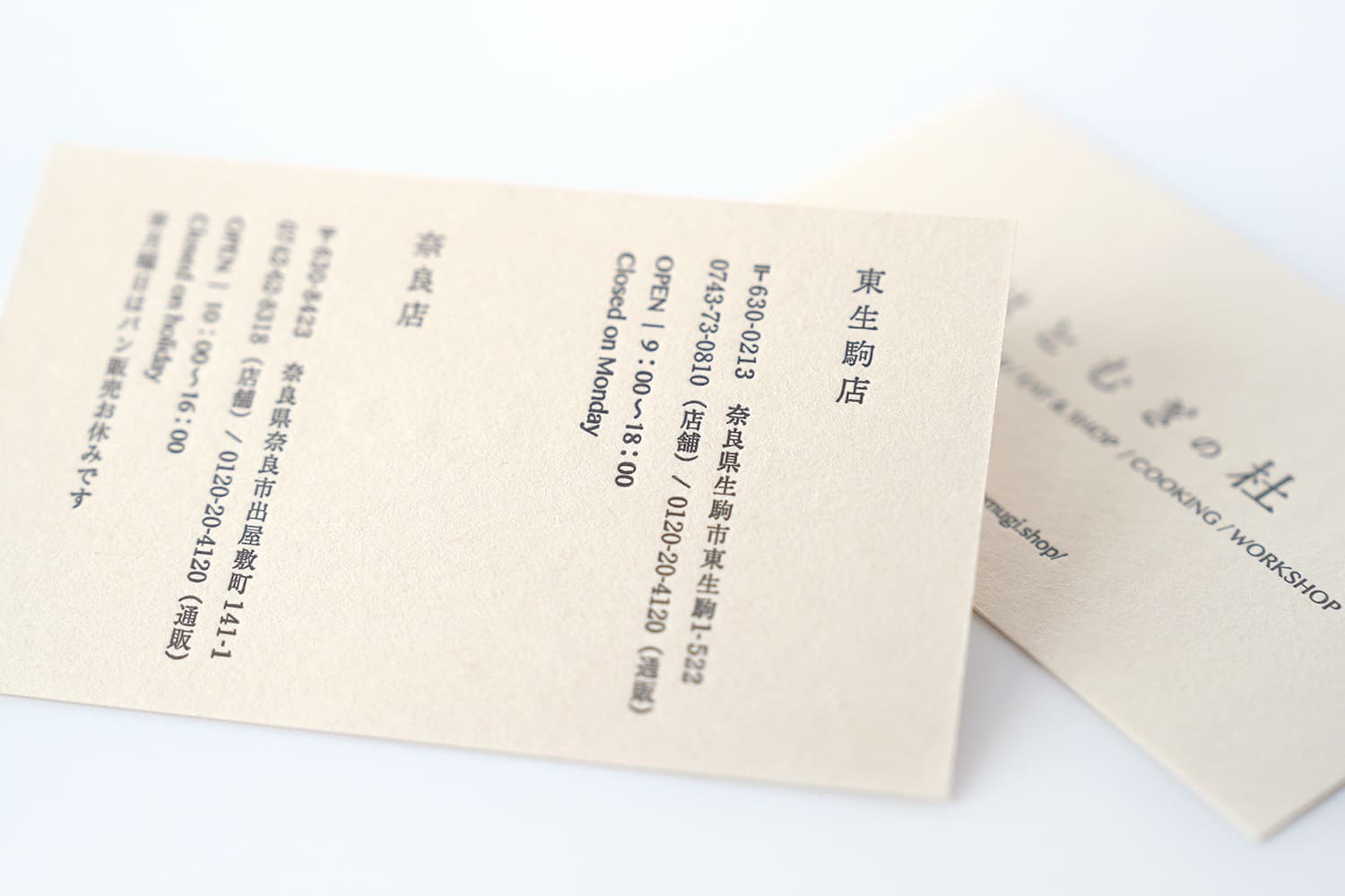 オーガニックな食材を使用した商品を取り扱う飲食店様のショップカード。生成の紙にふわっと押された活版印刷が、ナチュラルで優しい雰囲気を醸し出します。健康と環境に配慮した食材にこだわるクライアント様の自然派なイメージと重なり、オーガニックカフェとしてのブランドの世界観を体現したショップカードです。