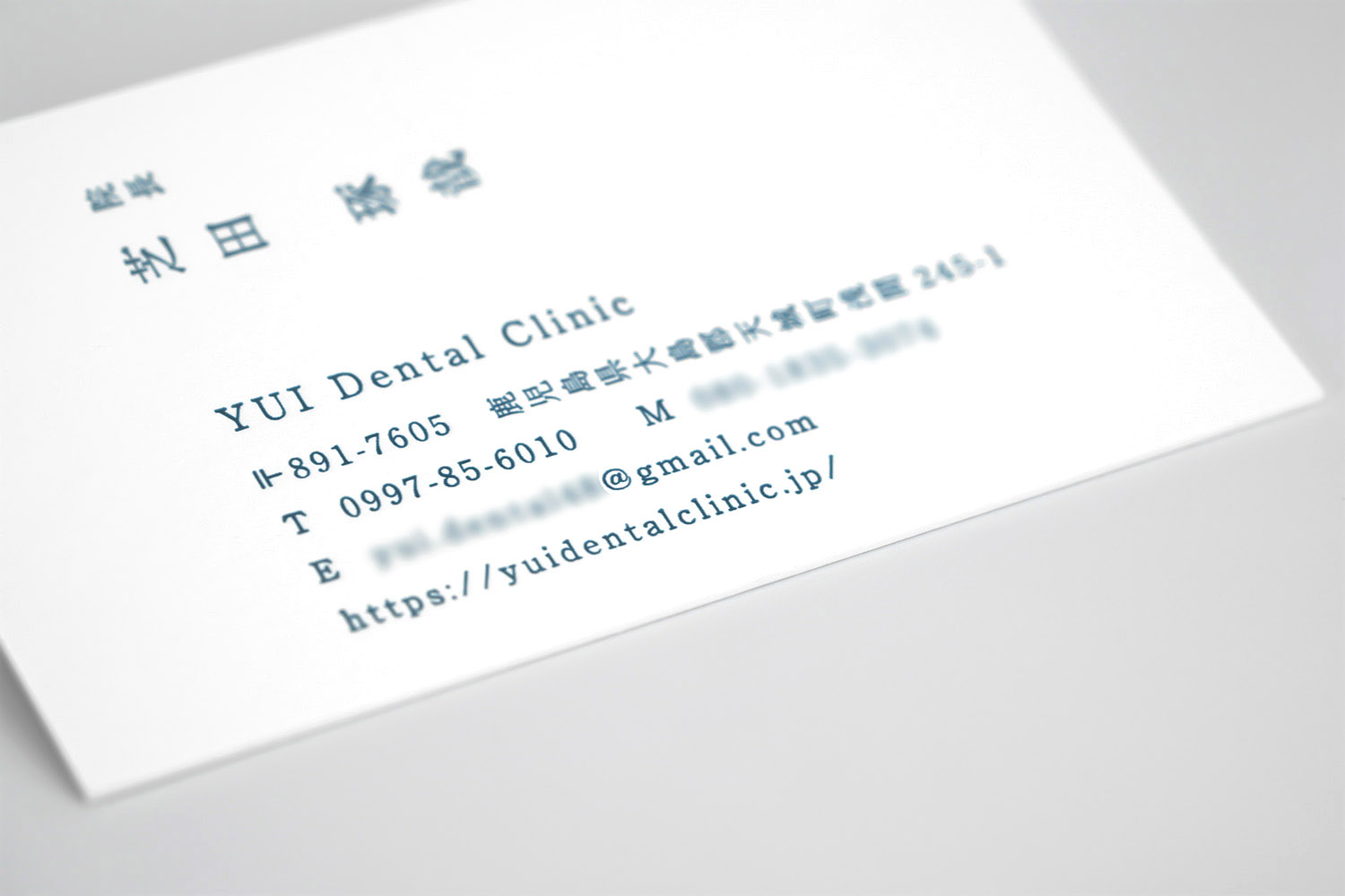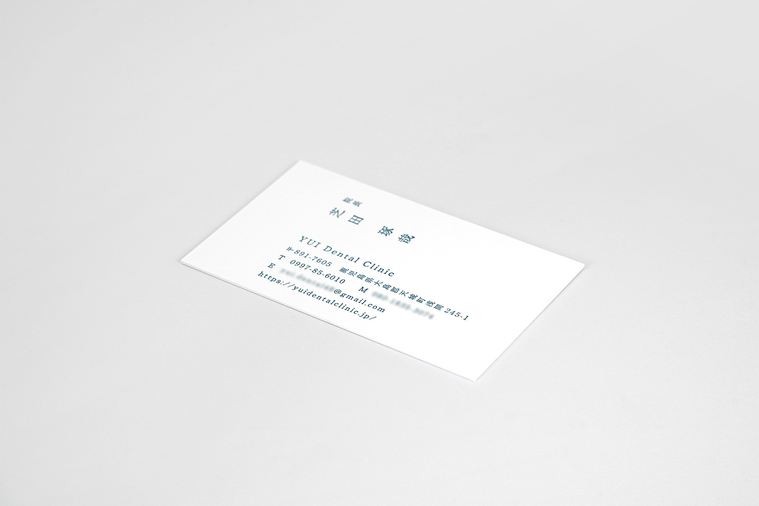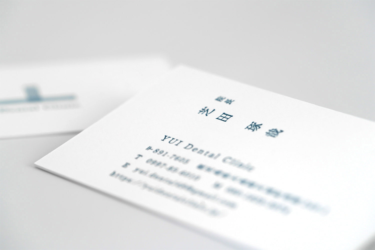 鹿児島県徳之島のデンタルクリニック、YUI Dental Clinicの歯科医師様のお名刺。超極細の活版印刷は、卓越した技術力を持つ職人の手仕事によって実現される。その熟練の技巧を派手に魅せるのではなく、そっと添えることで滲み出てくる奥ゆかしさ。真っ白な紙に映える呉須色。日本的な美を感ずる一枚です。