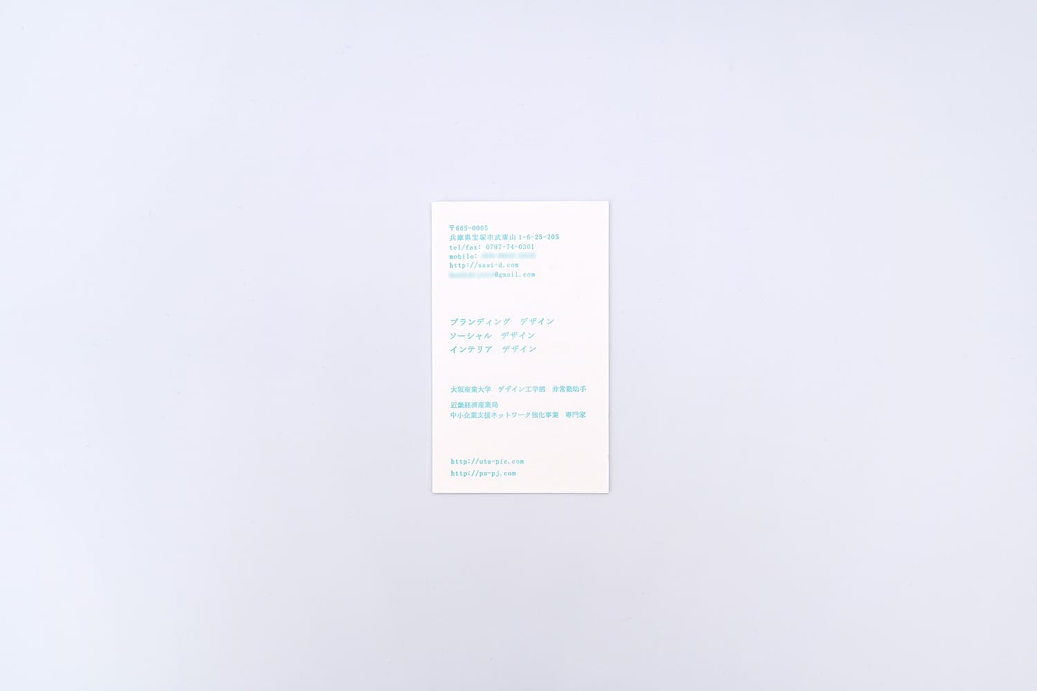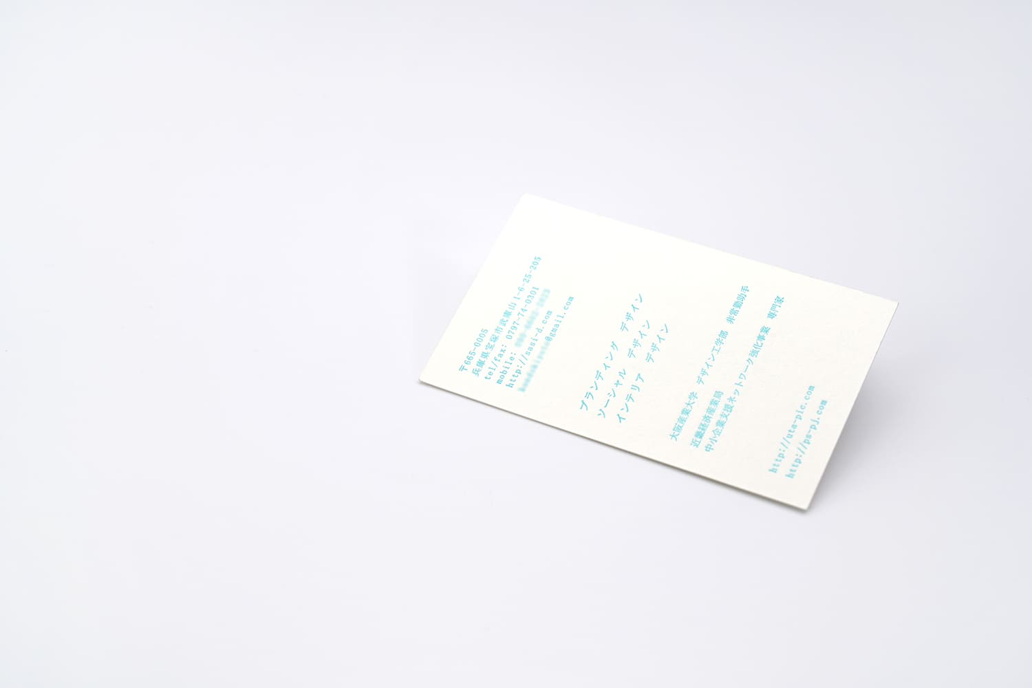 こちらはデザイナー様のお名刺。裏面は爽やかなブルーのインクで刷り上げ。瞳に優しい色味で、眺めていると心地良くなる仕上がりです。きっと受け取る方も、持ち主に対し柔らかく爽やかな印象を抱くことでしょう。世界観を構築するためにも、この様に随所で印象づけることが非常に重要です。