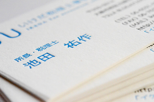 綺麗な凹みが出るクッション紙を使った活版印刷の名刺。活版印刷は技術力が必要で押す圧力やインクの色の再現性など職人の腕が非常に重要です。