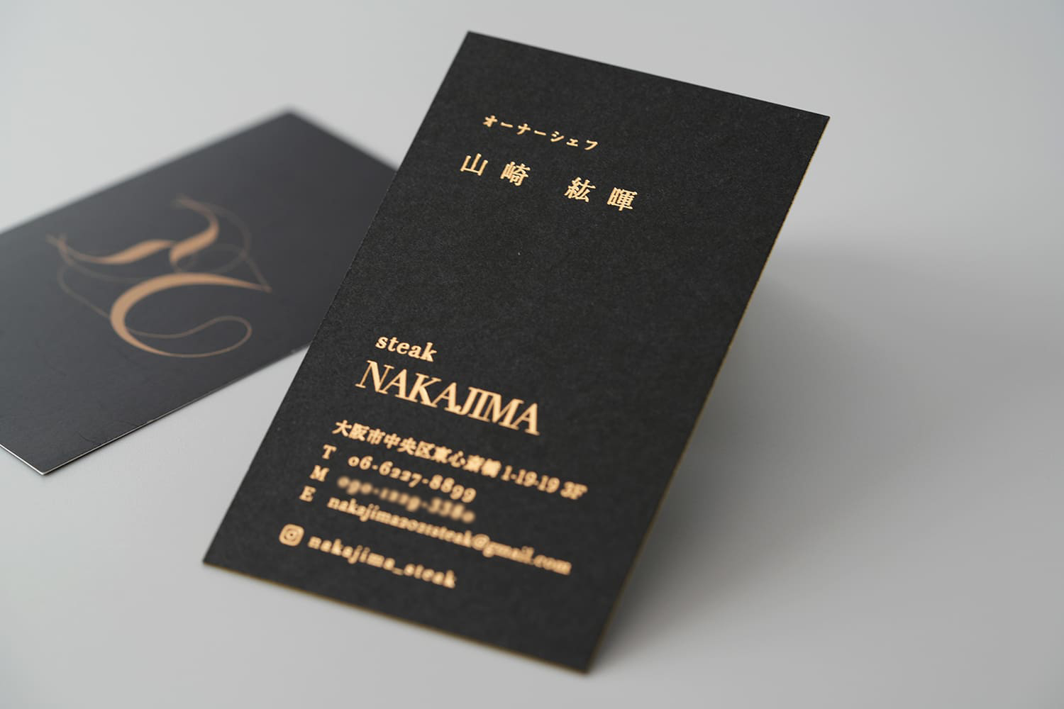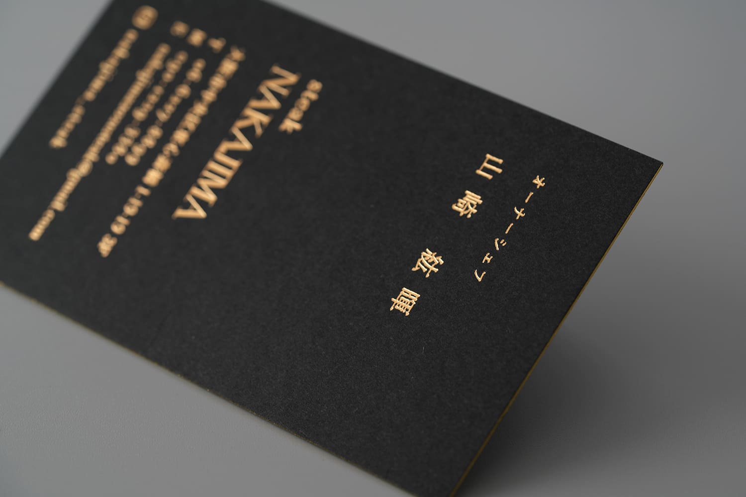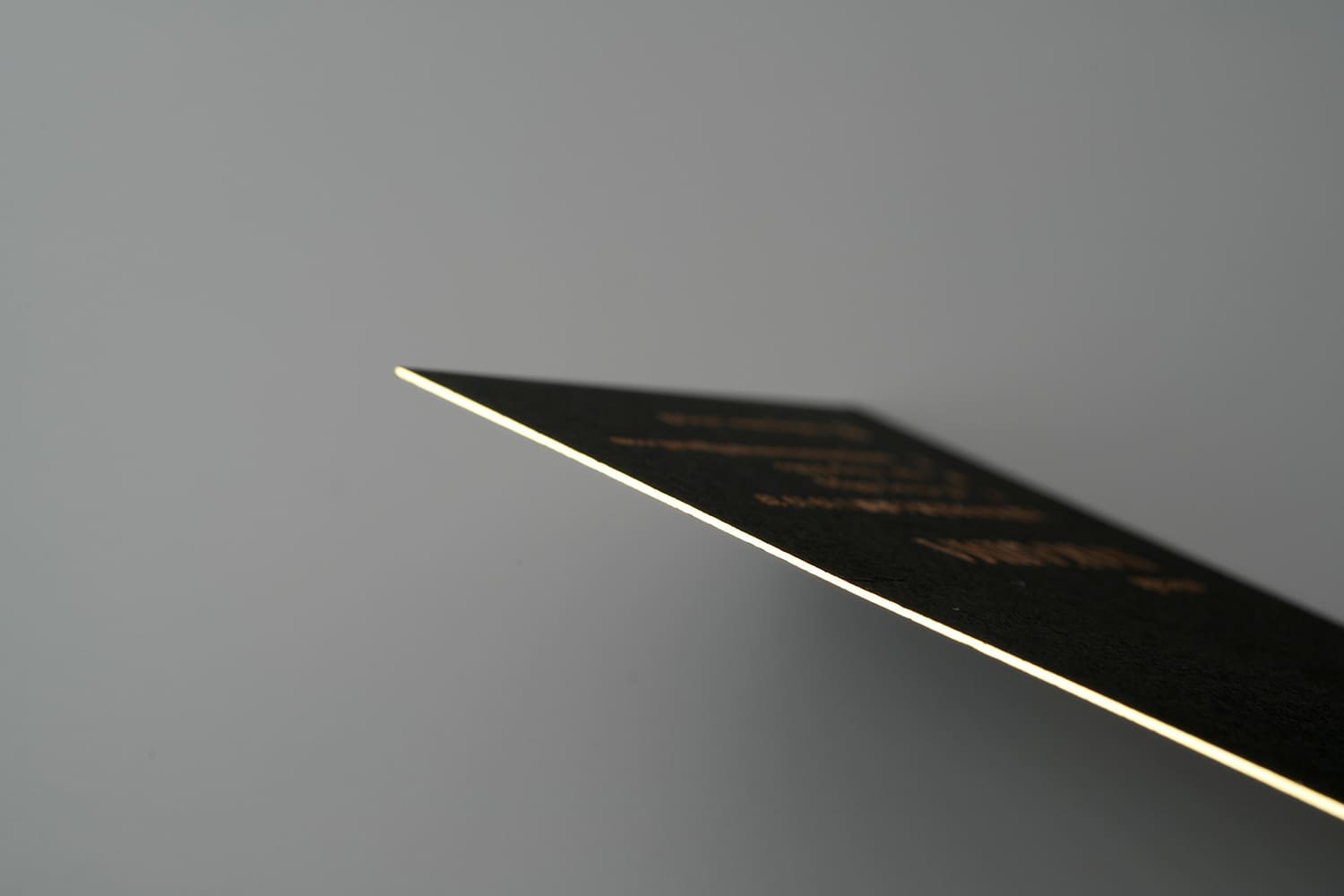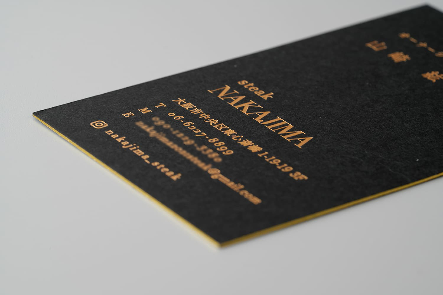 総じて、マットな質感の紙にゴールド系のカラーで印字を行い、重厚な仕上がりに。 オーナー様のお名刺には、全面金箔押しを施して特別感を演出。 文字部分の金箔押しは高度な技術が求められる職人技です。 小口もゴールドに染め上げることで、より高級感の際立つお名刺となっています。