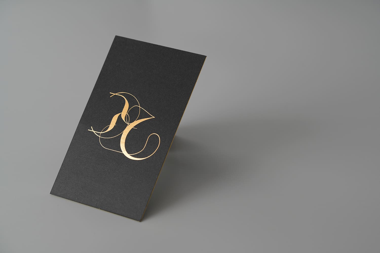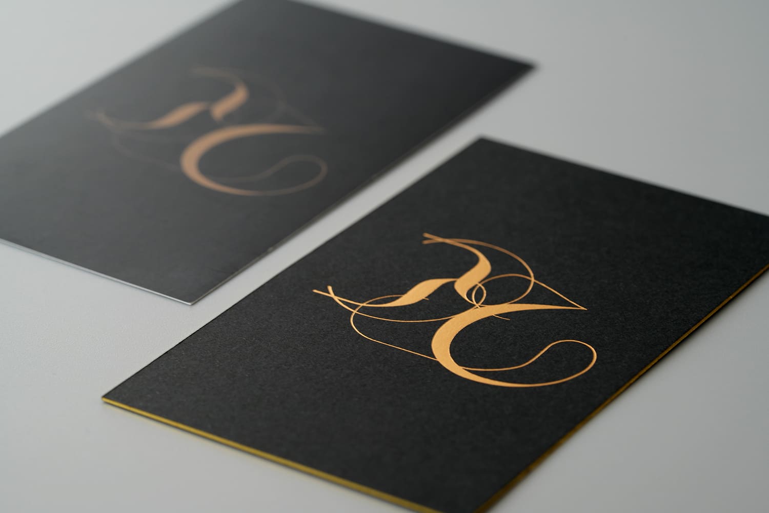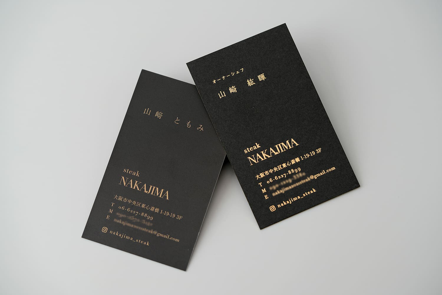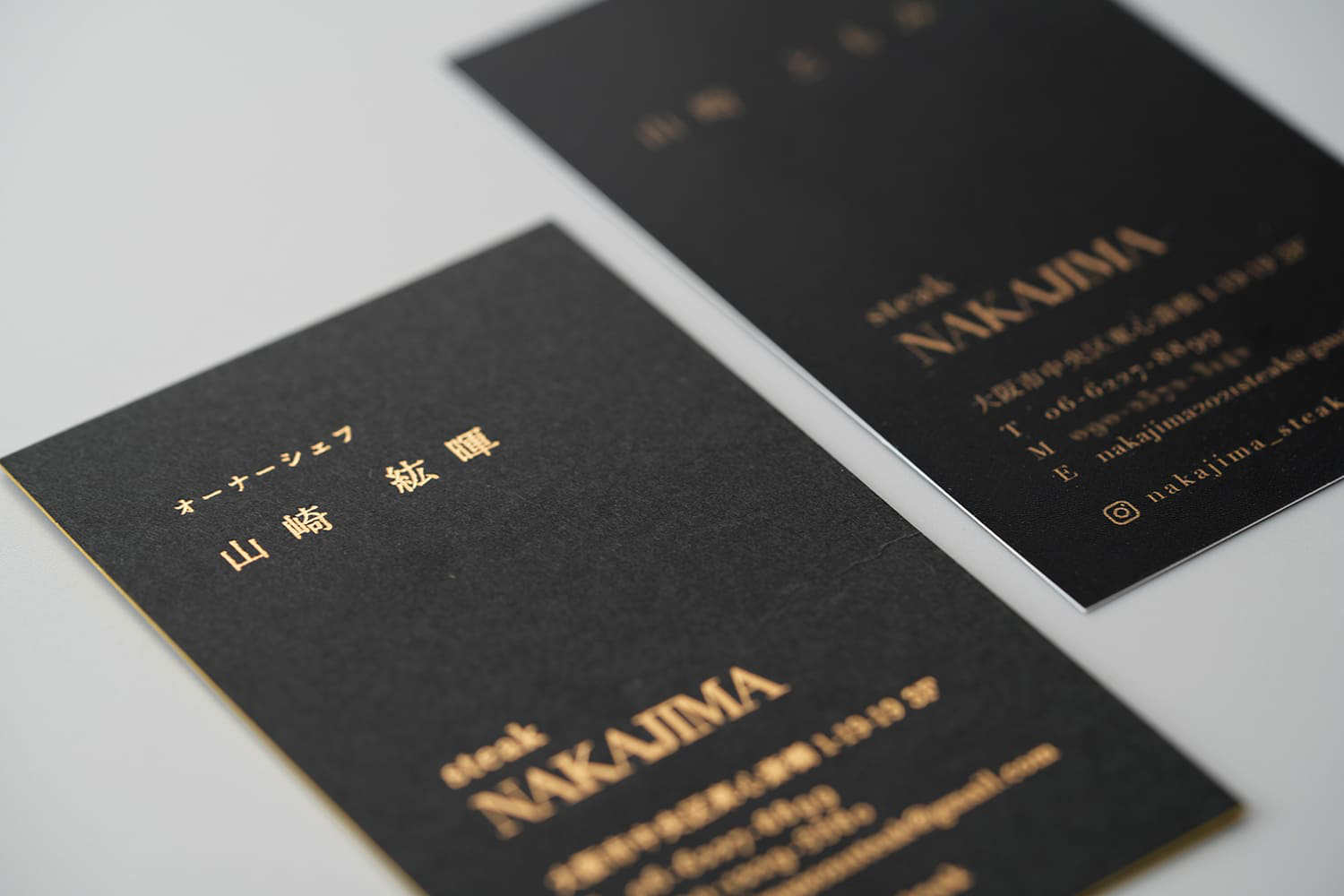 総じて、マットな質感の紙にゴールド系のカラーで印字を行い、重厚な仕上がりに。 オーナー様のお名刺には、全面金箔押しを施して特別感を演出。 文字部分の金箔押しは高度な技術が求められる職人技です。 小口もゴールドに染め上げることで、より高級感の際立つお名刺となっています。